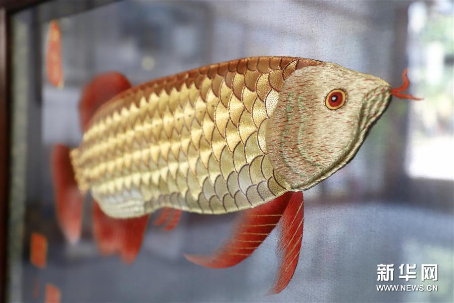 在北安市烏魚繡傳承展示館拍攝的北安烏魚繡作品(7月2日攝)。新華社發(劉赫垚 攝)