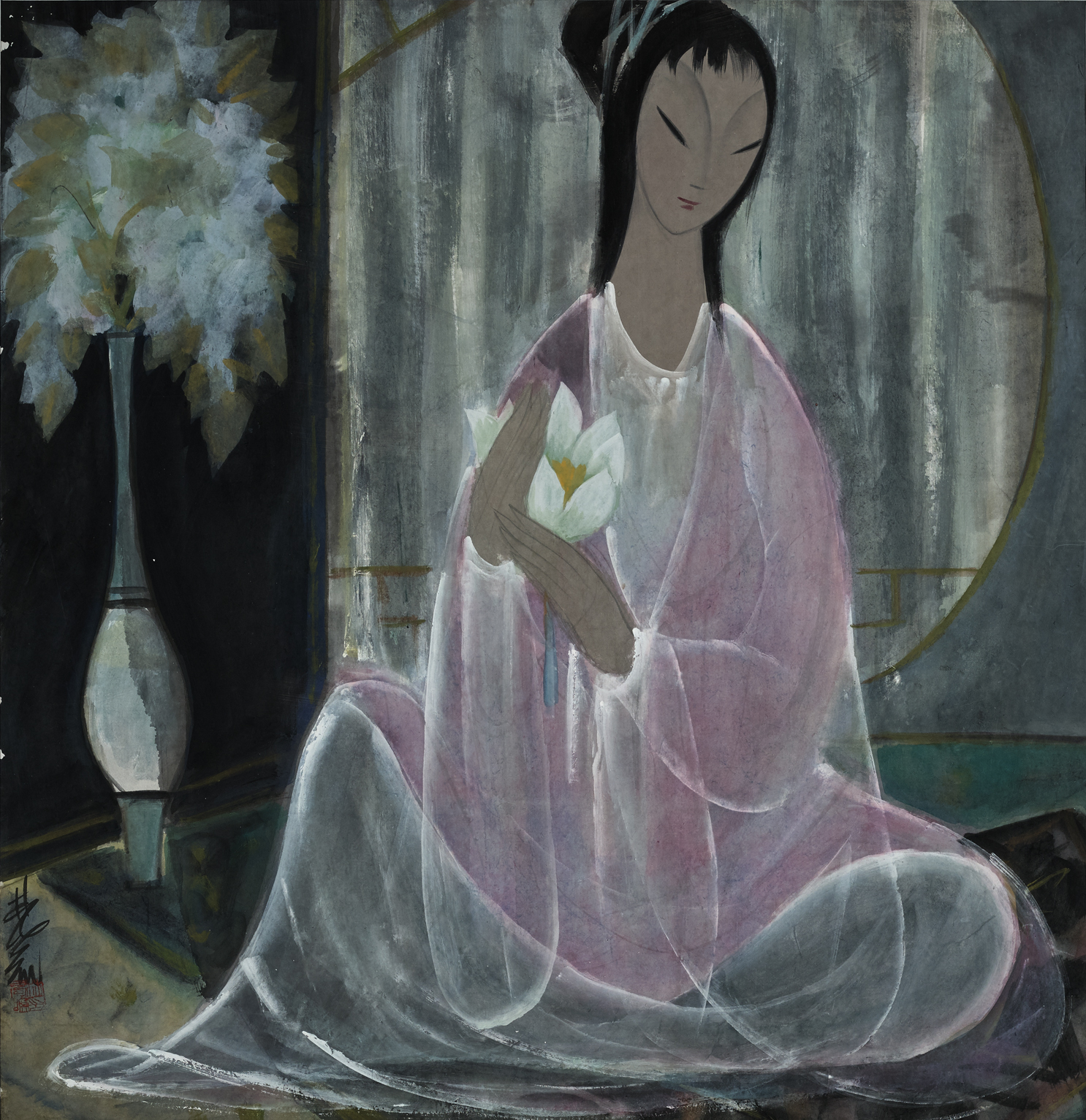 林風眠 捧白蓮紅衣仕女 中國畫 中華藝術宮藏