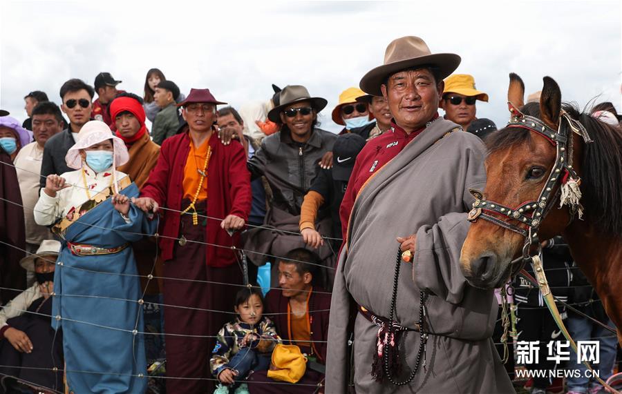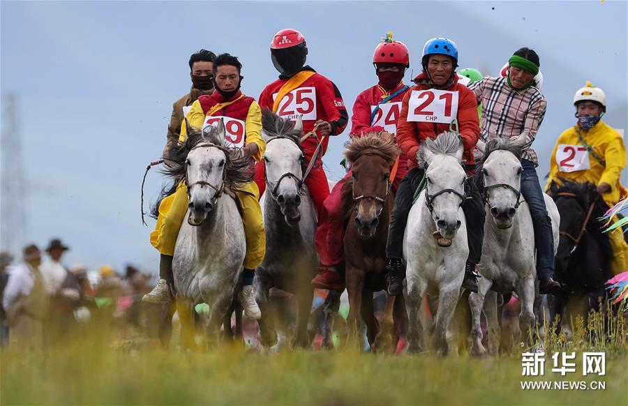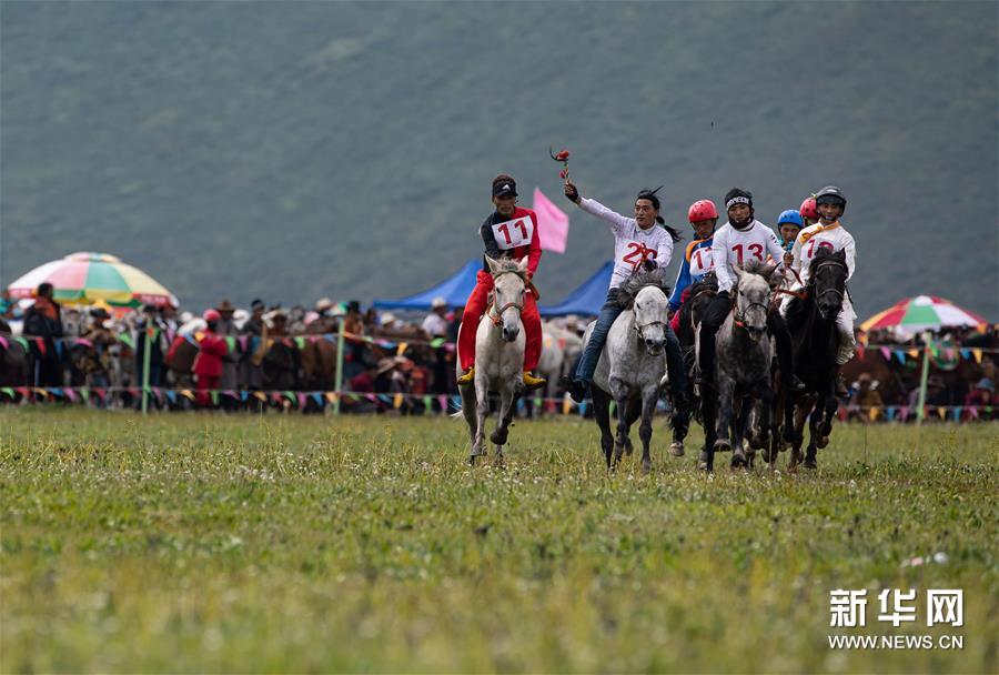 8月8日,來自牧區的青年騎手在扎青塘草原上賽馬。新華社記者江宏景攝