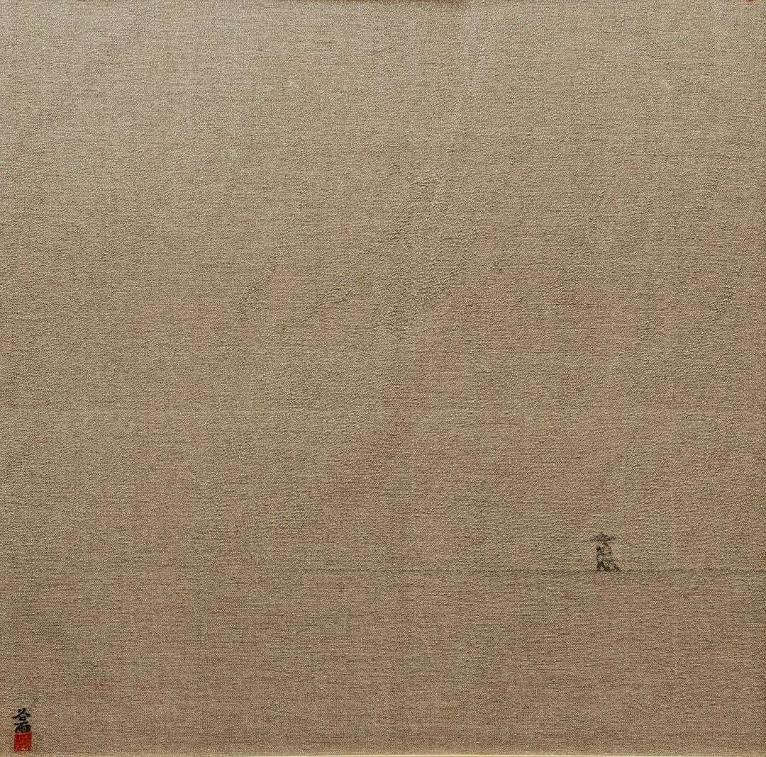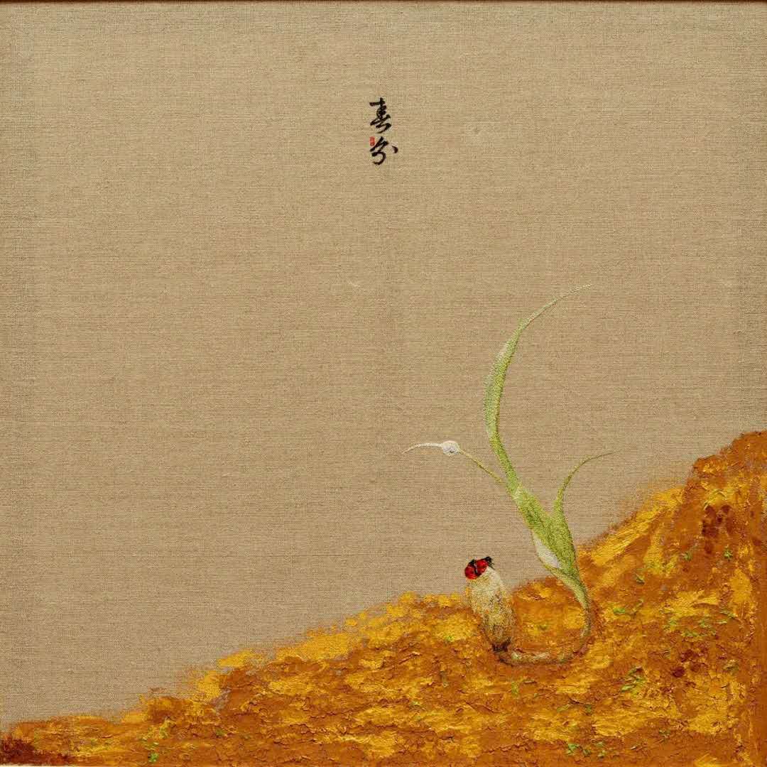 在作品《春分》中她大膽將泥土運用到刺繡畫面的經營中,農耕生活的印象與鄉土氣息悅然于畫面。