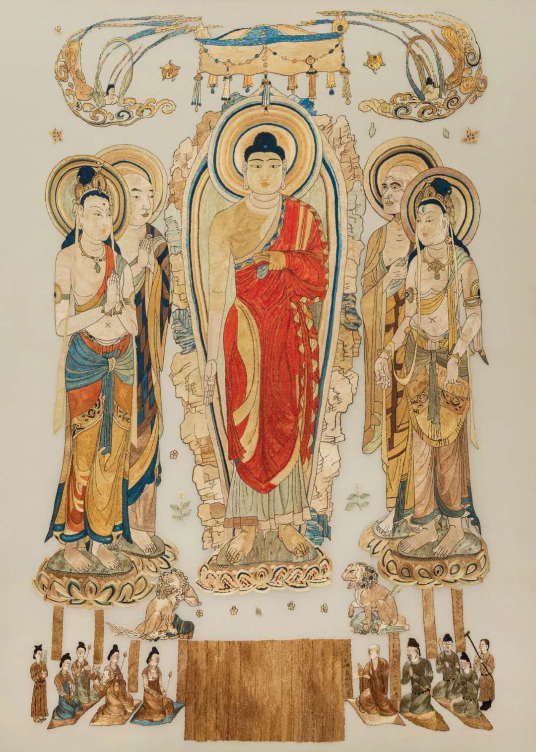 “溯本”指對敦煌莫高窟流失海外的唐代刺繡《涼州瑞像圖》(大英博物館命名為《靈鷲山說法圖》編號為MAS.0.1129,斯坦因編號Ch.00260)技法的挖掘、梳理、研究與復繡,以及敦煌莫高窟第 45 窟系列造像(7 幅)作品的繡制。