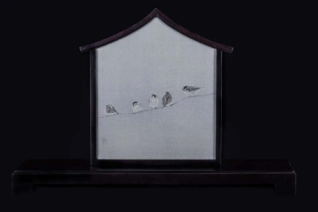 《姑蘇人家》是鄒英姿設計并繡制的系列現代屏風擺件,將蘇式民居的屋脊樣式抽象為幾何圖形,內容上選擇身邊常見的蘇州小景作為對象,視角獨到,情趣盎然。