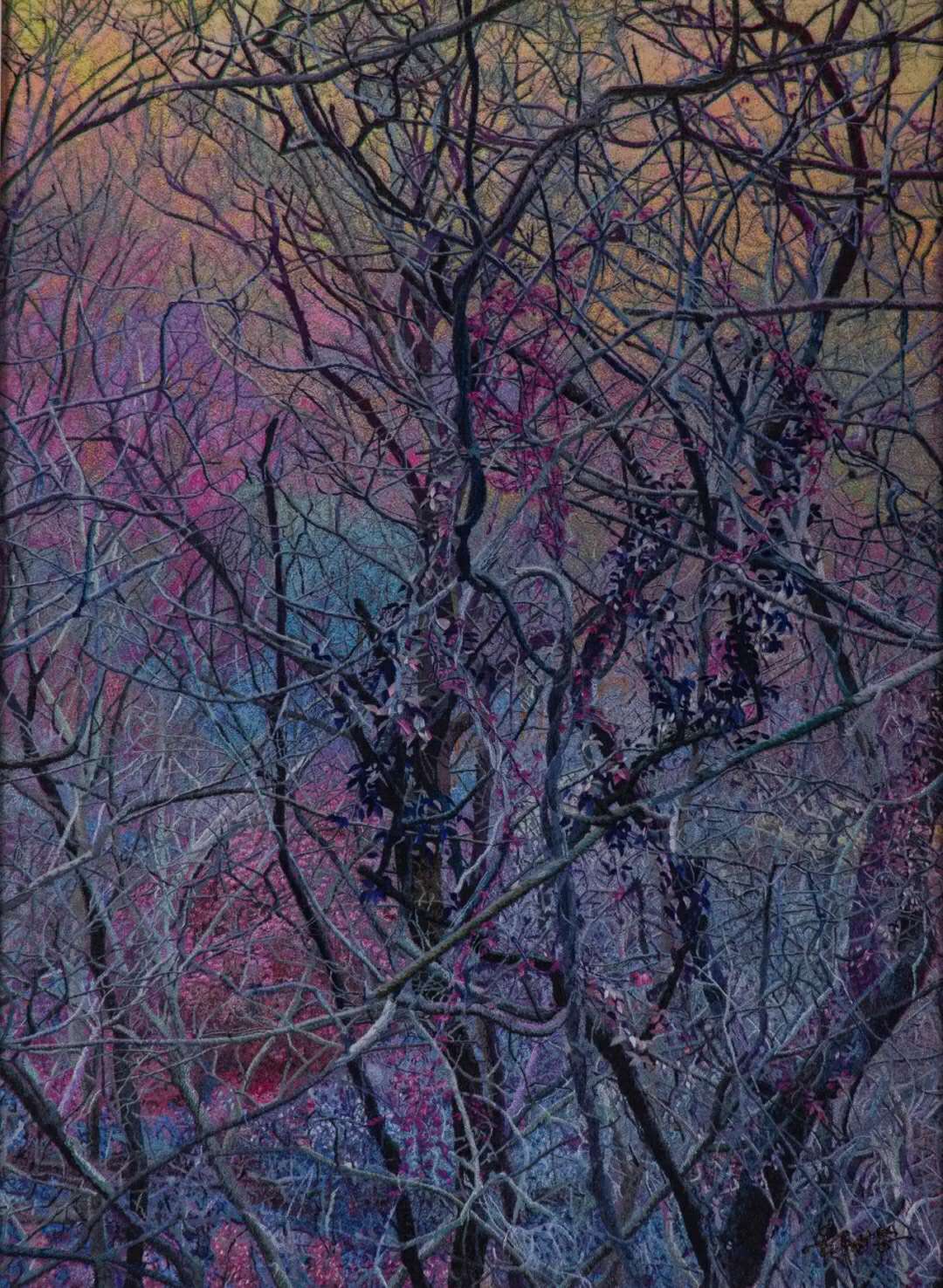 《纏繞》通過對色彩解構,使得作為傳統工藝的蘇繡呈現出其當代性的一面,此作品為一個系列。其中一幅為大英博物館所收藏。