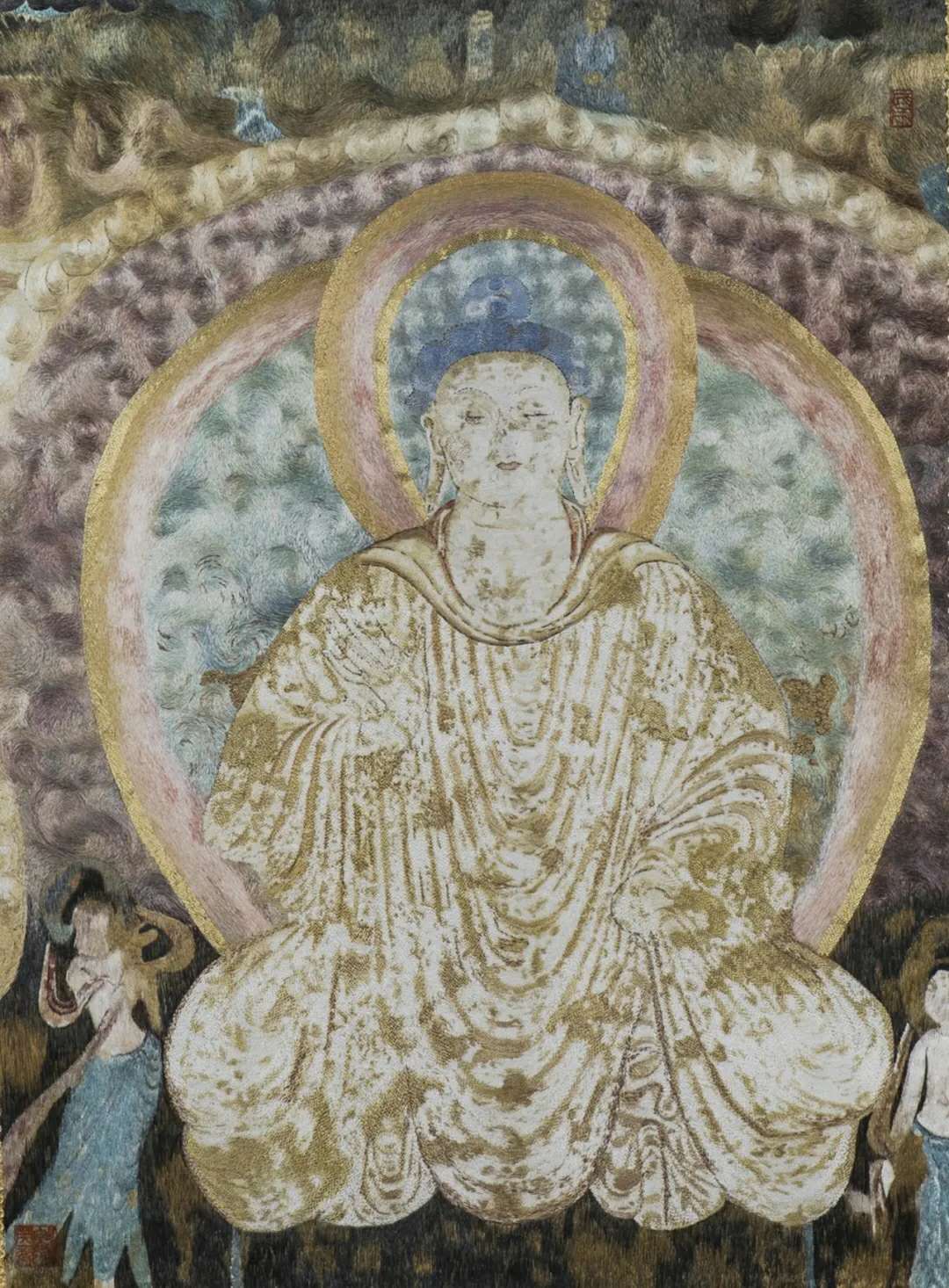 第三展廳的敦煌第45窟群像,以藝術家特有的滴滴繡針法進行繡制,這種針法的特點在于針腳短,可以避免長針腳絲線本身對光的折射,非常適合繡制古樸典雅的作品。這一系列作品前后耗費約十年時間,是鄒英姿刺繡針法技藝成熟的重要作品。