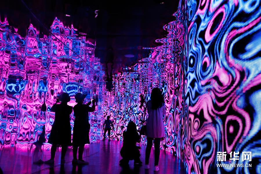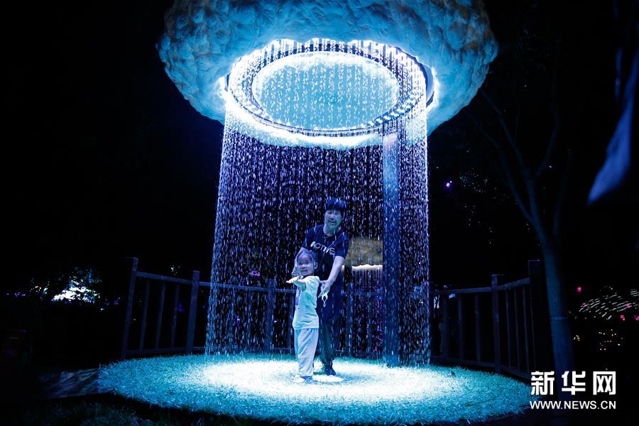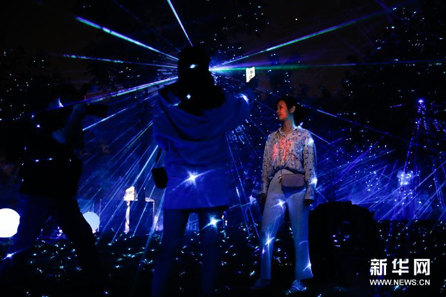 8月20日,在北京玉淵潭公園,參觀者欣賞光影藝術作品。新華社記者 張晨 攝