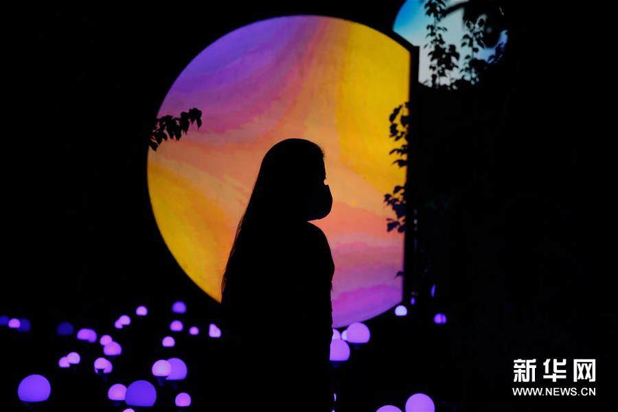 8月20日,在北京玉淵潭公園,一名女子參觀光影藝術作品。新華社記者 張晨 攝