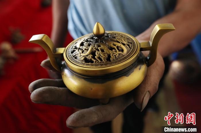 定西市銅鋁翻砂鑄造非物質文化遺產傳承人蔣勝平正展示他鑄造的銅器?!∮诰?攝