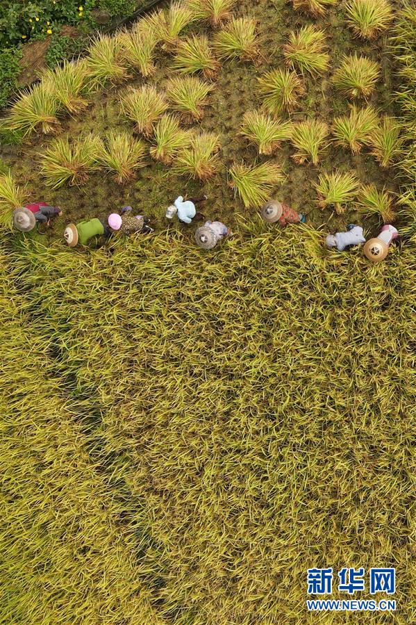 9月7日,在湖南省湘西土家族苗族自治州吉首市乾州街道西門口村,村民在田間收割稻谷(無人機照片)。 當日是白露節氣,各地田間地頭一片農忙景象。 新華社發(劉振軍 攝)