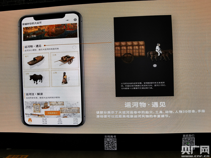 隨著畫面切換,畫卷來到1550年的通州,這里是由水路進京的必經之路,一名“驗糧官”講述著明朝漕運的興盛。騰訊智慧景區高級產品經理何信瑞告訴記者,除了在大屏幕上看到大運河穿越時空的變遷外,參觀者還可以通過“穿越時空的大運河”小程序,把千年的運河文化“裝”進手機里。何信瑞說:“《運河圖》選取了大運河(歷史)中比較重要的14個場景,通過動畫演繹、場景演示的展示,以視聽結合的方式,讓參觀者知道(大運河歷史上)發生了什么故事和歷史事件?!?/p>