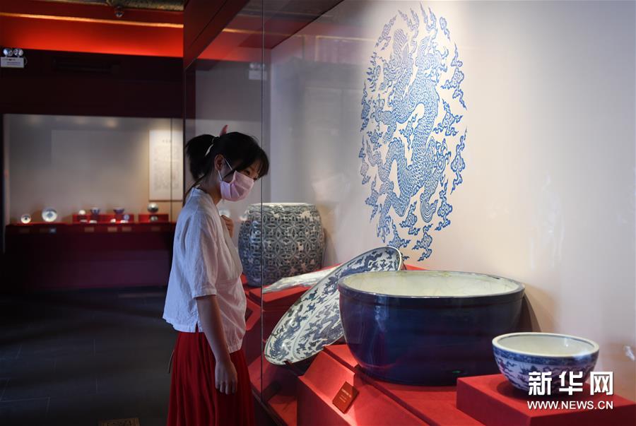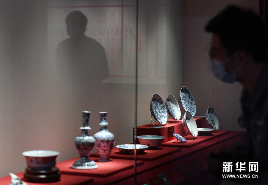 9月21日拍攝的青花斯伊蘭花紋綬帶耳葫蘆扁壺,右為故宮院藏,左為景德鎮出土修復件。新華社記者 金良快 攝