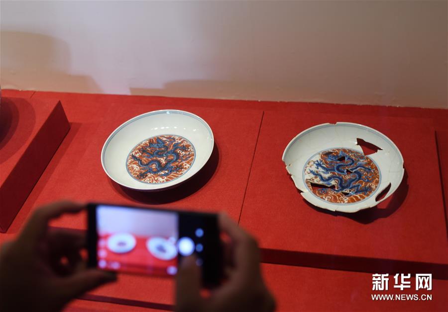9月21日,參會嘉賓拍攝青花加礬紅彩海水龍紋盤,左為故宮院藏,右為景德鎮出土修復件。新華社記者 金良快 攝