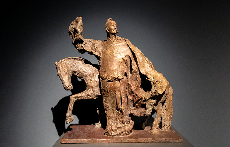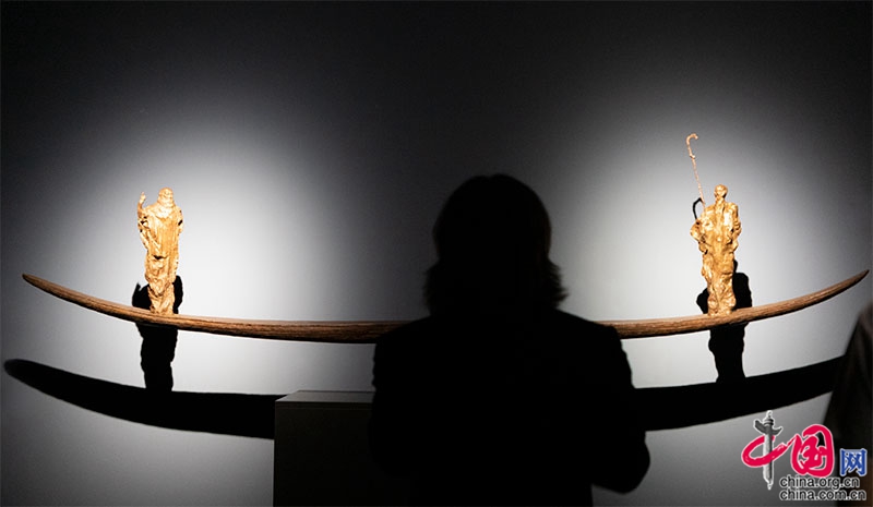 此外,吳為山致力于通過雕塑藝術促進中外文化交融互鑒,積極推動中國文化走向世界舞臺。在此次參展的雕塑作品中,有幾部作品頗有意味地選取了不同時期的兩位中外藝術家,比如《在一條船上——達芬奇與齊白石的神遇》,木船兩端遙遙相望的達芬奇與齊白石;《心靈之門——塔拉斯舍甫琴科與杜甫對話》中隔空對話的烏克蘭詩人塔拉斯·舍甫琴科和唐代詩人杜甫,通過雕塑藝術展現不同文化之間的碰撞交融。當觀眾走近這些雕塑作品,不僅可以體會到中國傳統文化的魅力,也能通過吳為山的雕塑美學體味中外文化內蘊。