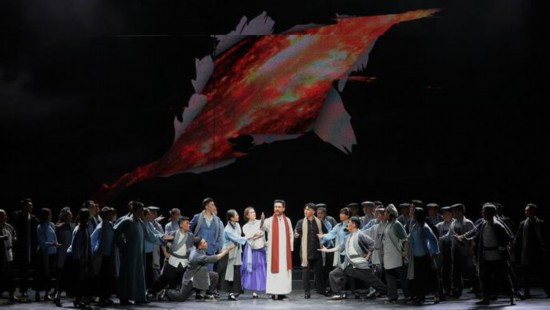 在李大釗被捕之后,與趙紉蘭有大段隔空對唱,由傳統的京劇二黃對唱銜接到昆腔,從京劇的板腔體變為昆曲的曲牌體,通過曲牌體逢唱必動的歌舞性來打破原有的舞臺沉悶感,把原有的情景“盤活”,以此抓住觀眾的目光,是本劇中的首創。在罷工一場戲中,為了增強地域特色,融入京韻大鼓,北京曲藝等元素,并借鑒西方歌劇中“卡農”的形式,加入工人群眾的重唱、輪唱,更加貼合劇情需要,使得這場戲具有轟轟烈烈的氛圍。為將《李大釗》打造為史詩級精品力作,北京京劇院、北京交響樂團聯合配樂。導演徐春蘭介紹,“交響樂恢宏,傳播革命的詩情,舞臺大膽將視頻與實景結合,渲染氣勢。國際歌與京劇音樂結合,適合當代觀眾審美?!?/p>