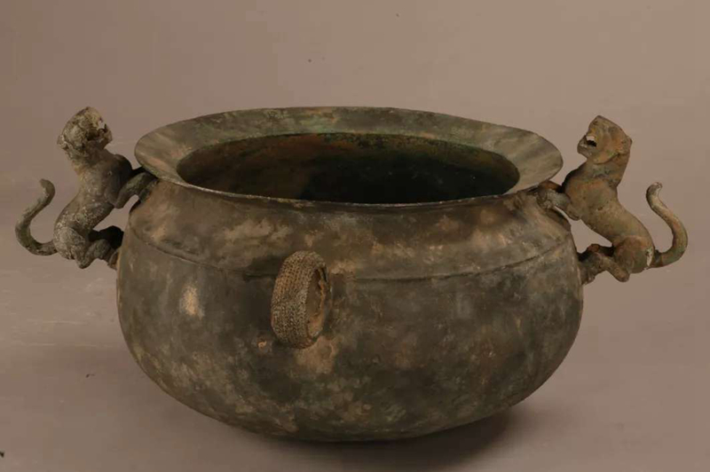 飾虎銅釜:戰國末期至西漢前期,赫章可樂274墓出土,銅釜出土時套于死者頭部,口沿加鑄儀態威猛的立虎,虎上套頸圈,彰示墓主不容侵犯的權威性和人所不能的神秘性。