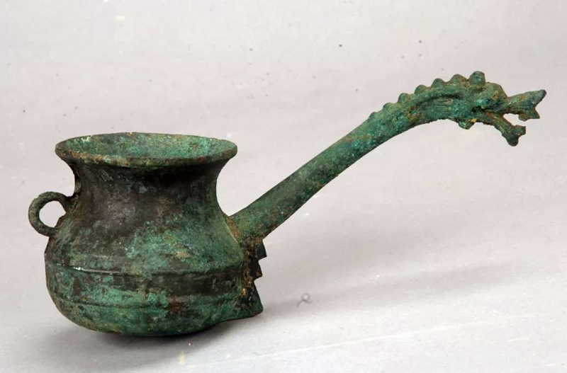 龍首柄銅釜:西漢,六盤水市黃土坡,銅釜長柄首部下彎,鑄成龍首之形,龍口張開,尖狀雙耳后掠,一副撥云前行的形態。長長的柄身似矯健的龍身,造型厚重精美。