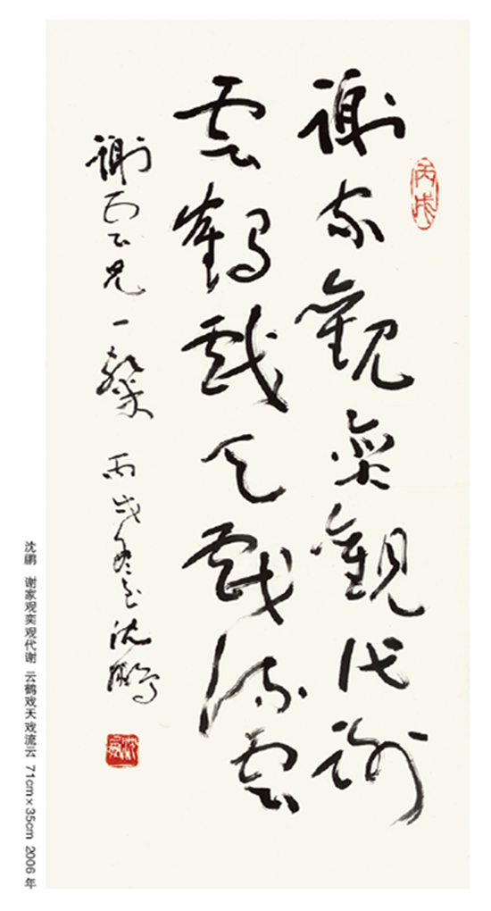 沈鵬先生曾經為謝云先生寫過一副特別的嵌名聯,本次展覽也是非常重視,特意抱病電賀展覽成功。沈鵬先生題賀的內容是:“祝書法事業多元創造,不拘一格,容納八方,廣泛融合各種文化風格。勇攀高峰,其不在遠也。祝謝云仁兄及各位嘉賓筆健,體健!