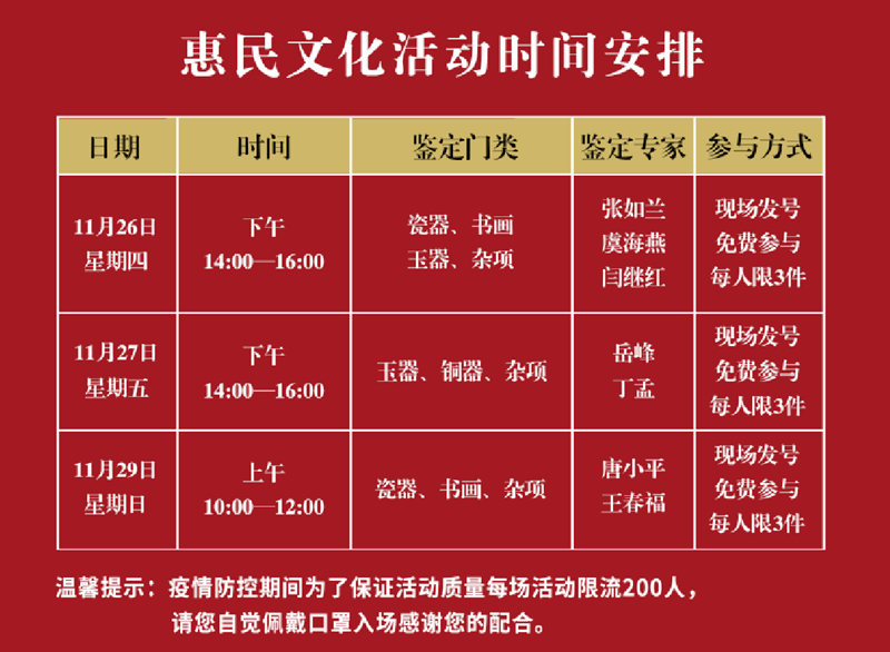 據悉,文物博覽會地點在北京古玩城五層多功能廳,公眾開放日為11月26日--28日的9:30--17:30,以及11月29日的9:30--15:00。其中惠民拍賣會11月28日上午10:00開始。三場惠民鑒定的時間分別是:11月26日下午14:00——16:00;11月27日下午14:00——16:00;11月29日上午10:00——12:00。觀眾可關注“北京古玩城公眾號”,提前領取電子版開幕請柬免費參觀。
