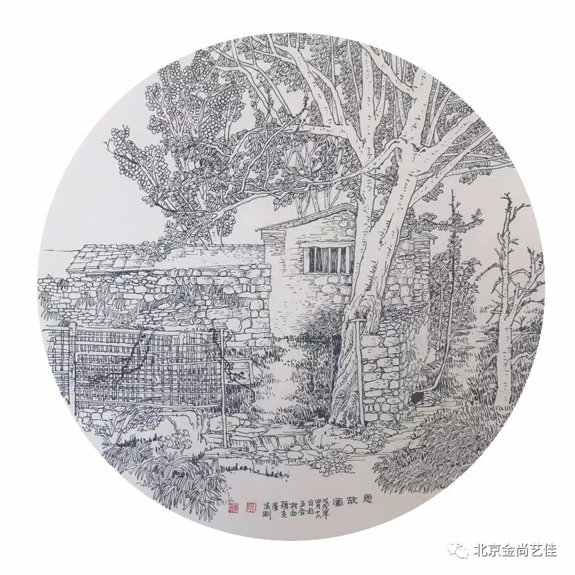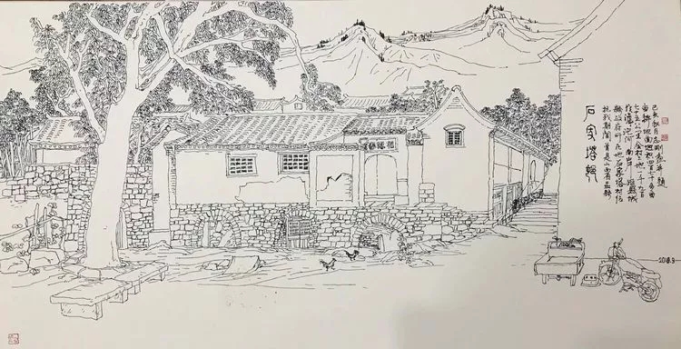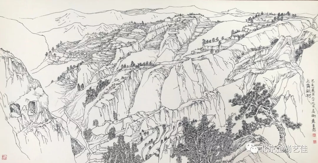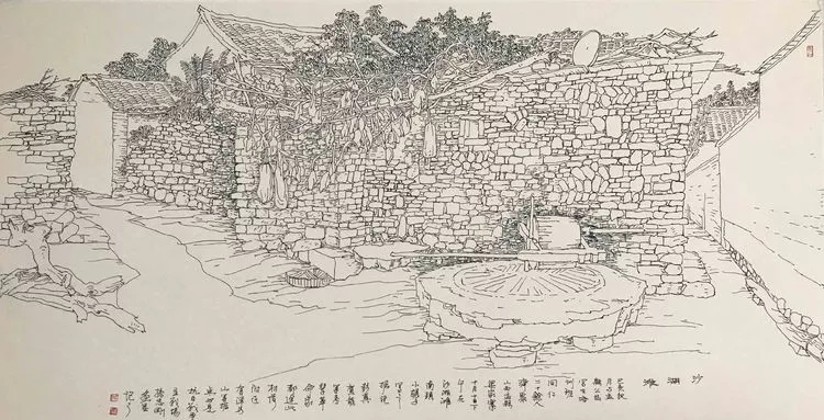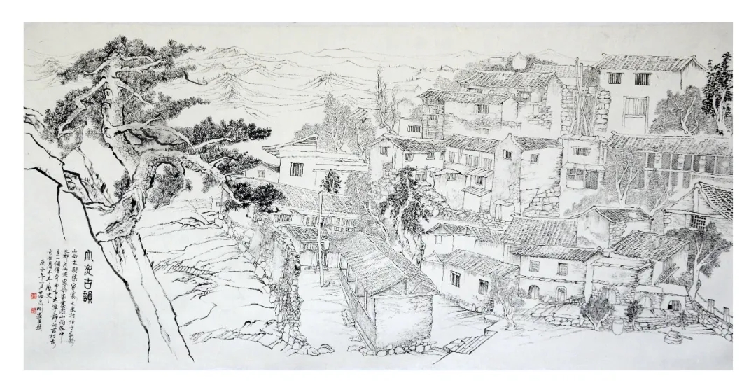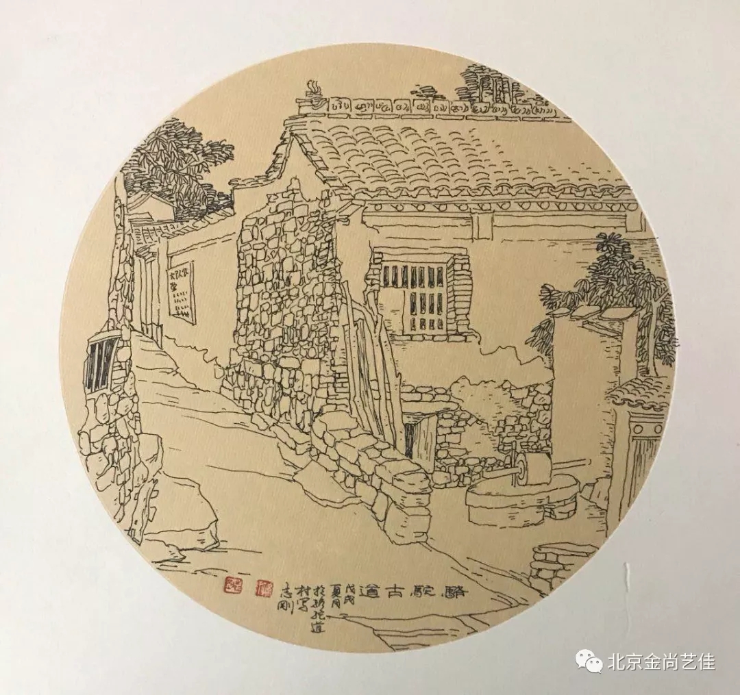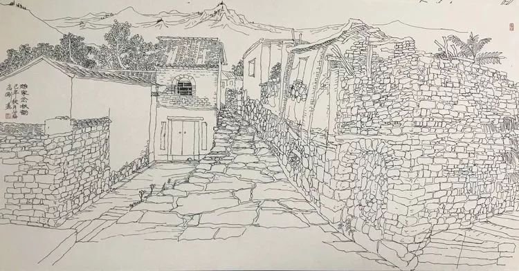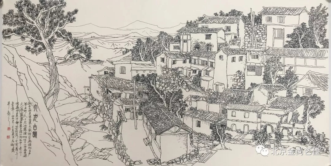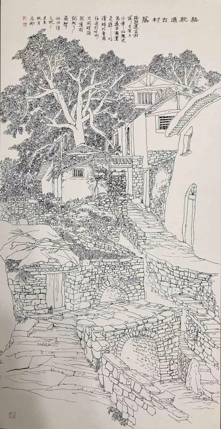 志剛多用針管筆、簽字筆畫寫生,精于提煉,善于取舍。在辨識、梳理山脈溝壑,林木泉石、河床坡岸、屋宇院落等結構形態時,擺脫焦點透視的制約以及“目有不及”、“所見不周”的狹隘視野和眼前實景的約束,予以理性的歸納,注重物象之間的置列與交互,經營畫面,置陳布勢,臨見妙裁。在構圖布局的統領下,線與線之間遵循陰陽辯證、對立統一的法則,依照顧盼、揖讓、交錯、呼應的形式規律組合排列,形成疏密、主次、強弱、繁簡、曲直、齊而不齊、亂而不亂,有秩序的漸次變化,富有韻律和節奏,增強了線描的魅力和畫面的美感,使觀者賞心悅目。
