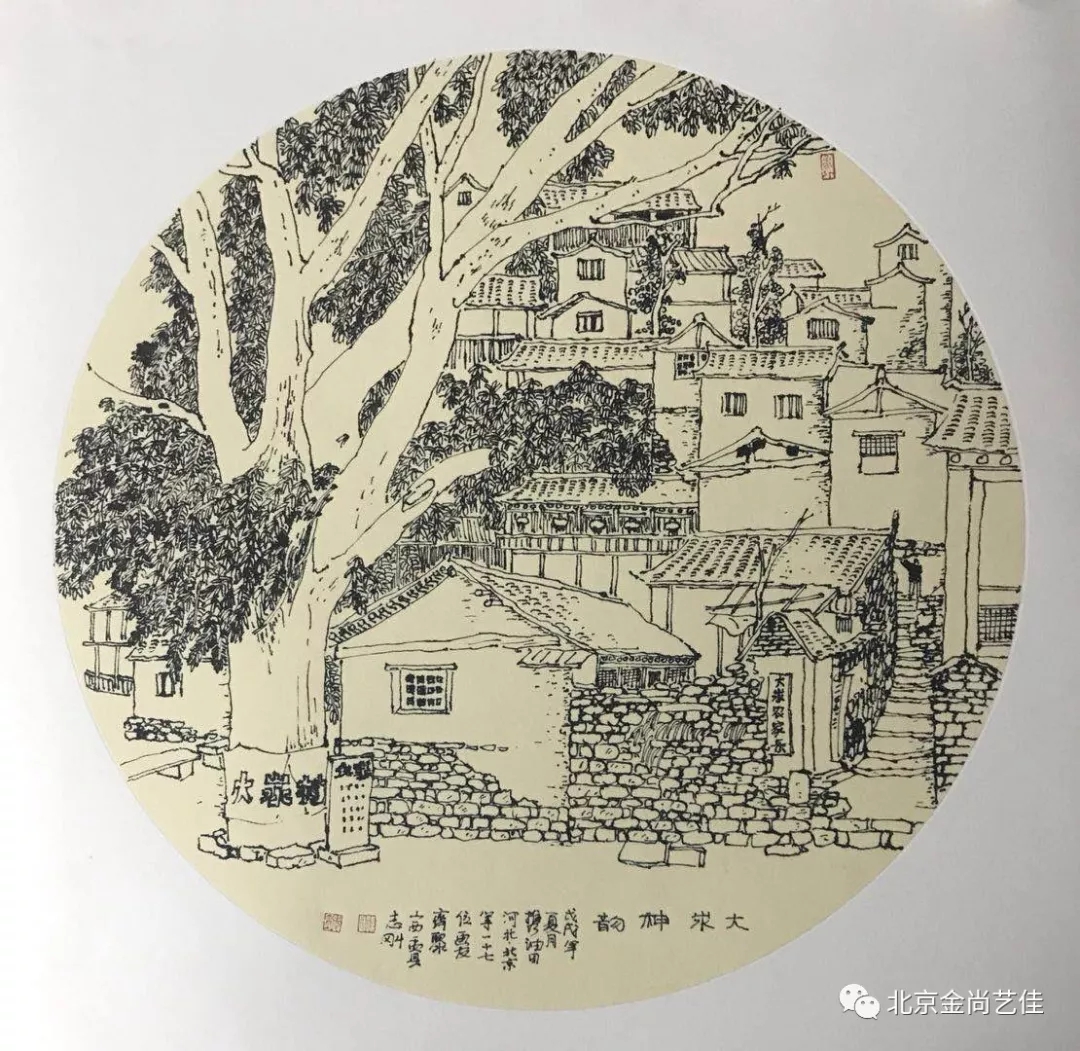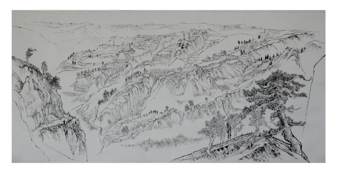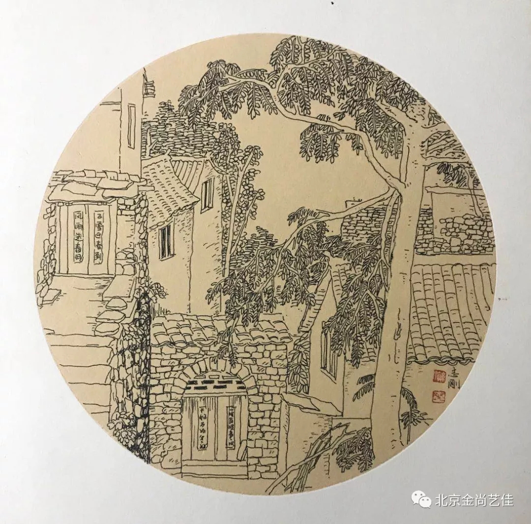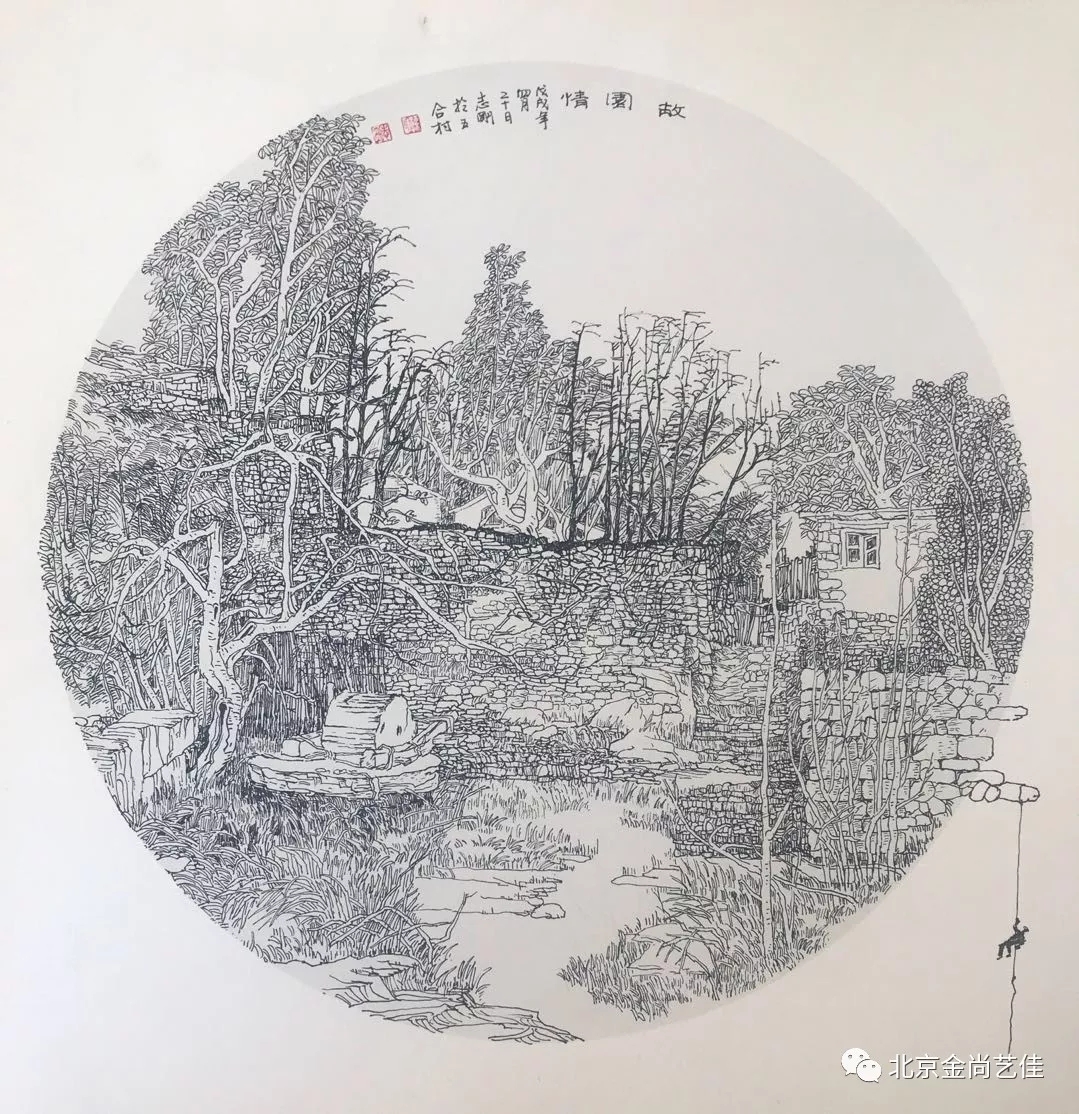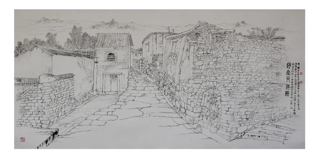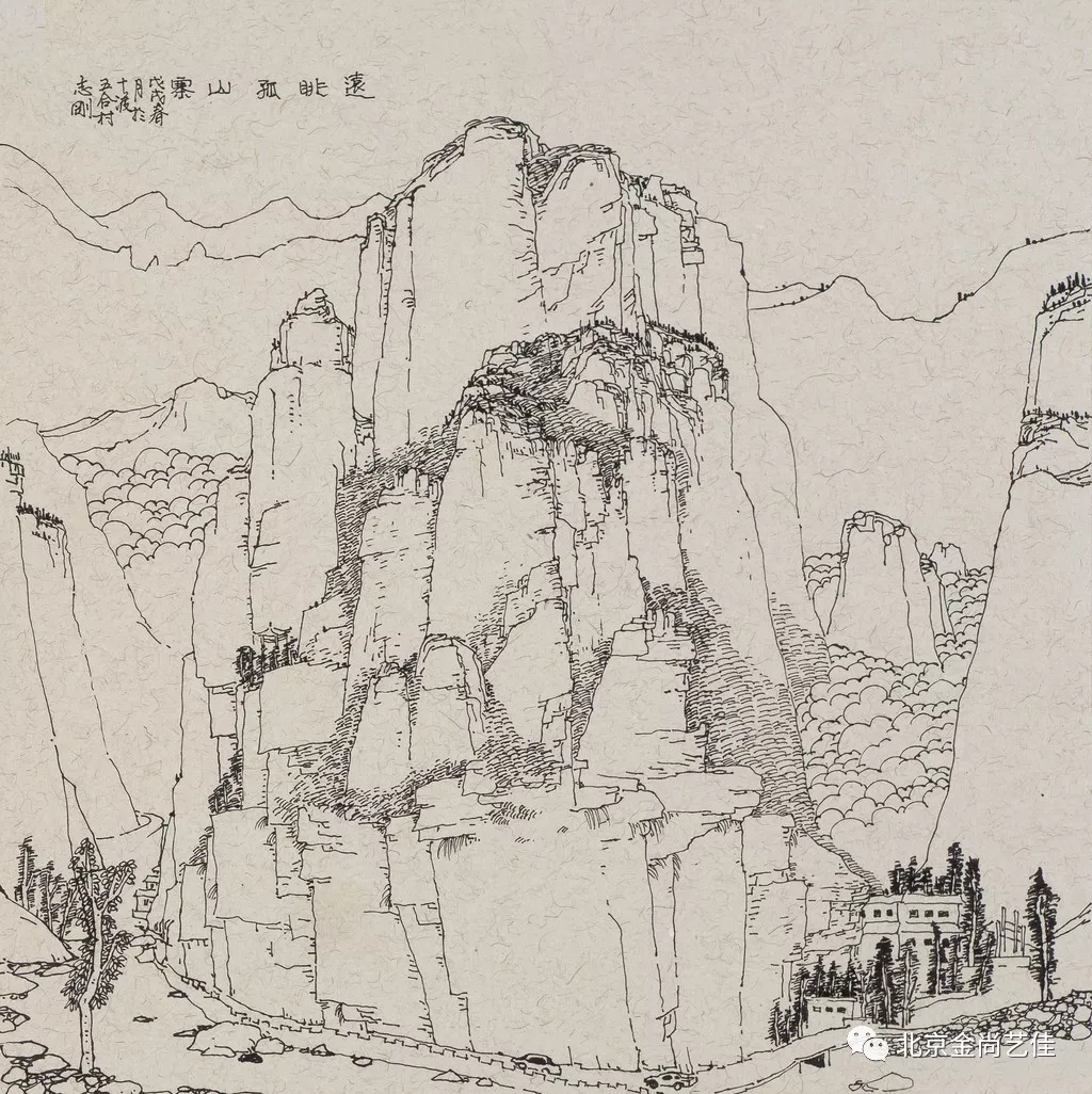 志剛多用針管筆、簽字筆畫寫生,精于提煉,善于取舍。在辨識、梳理山脈溝壑,林木泉石、河床坡岸、屋宇院落等結構形態時,擺脫焦點透視的制約以及“目有不及”、“所見不周”的狹隘視野和眼前實景的約束,予以理性的歸納,注重物象之間的置列與交互,經營畫面,置陳布勢,臨見妙裁。在構圖布局的統領下,線與線之間遵循陰陽辯證、對立統一的法則,依照顧盼、揖讓、交錯、呼應的形式規律組合排列,形成疏密、主次、強弱、繁簡、曲直、齊而不齊、亂而不亂,有秩序的漸次變化,富有韻律和節奏,增強了線描的魅力和畫面的美感,使觀者賞心悅目。