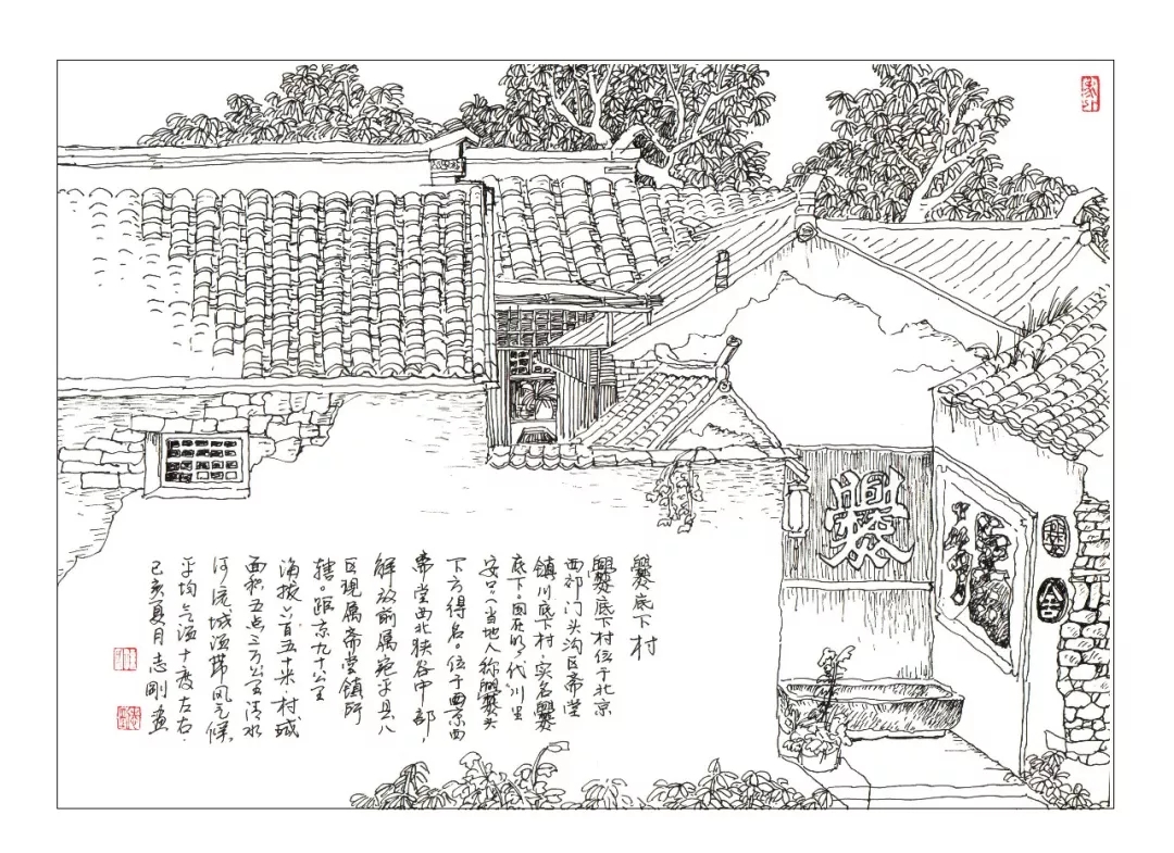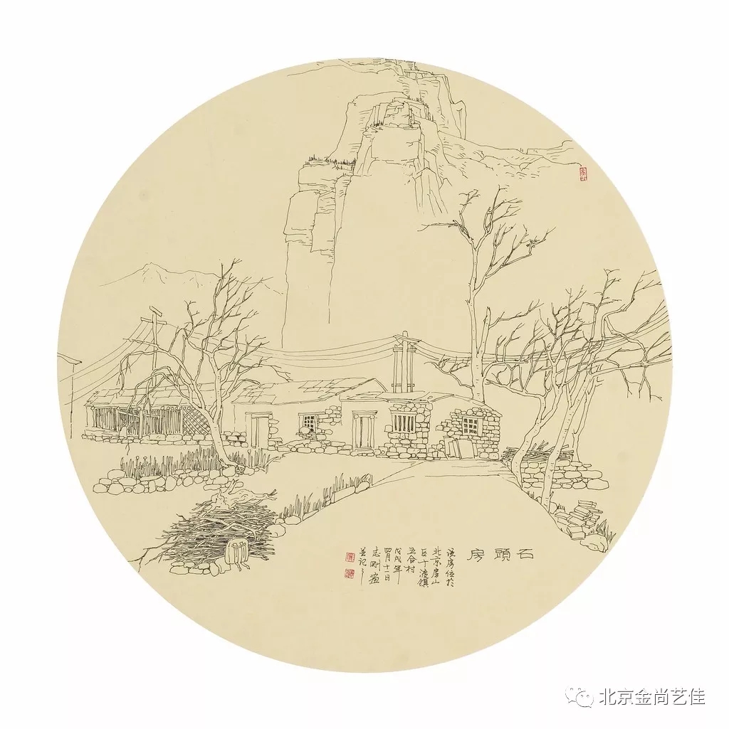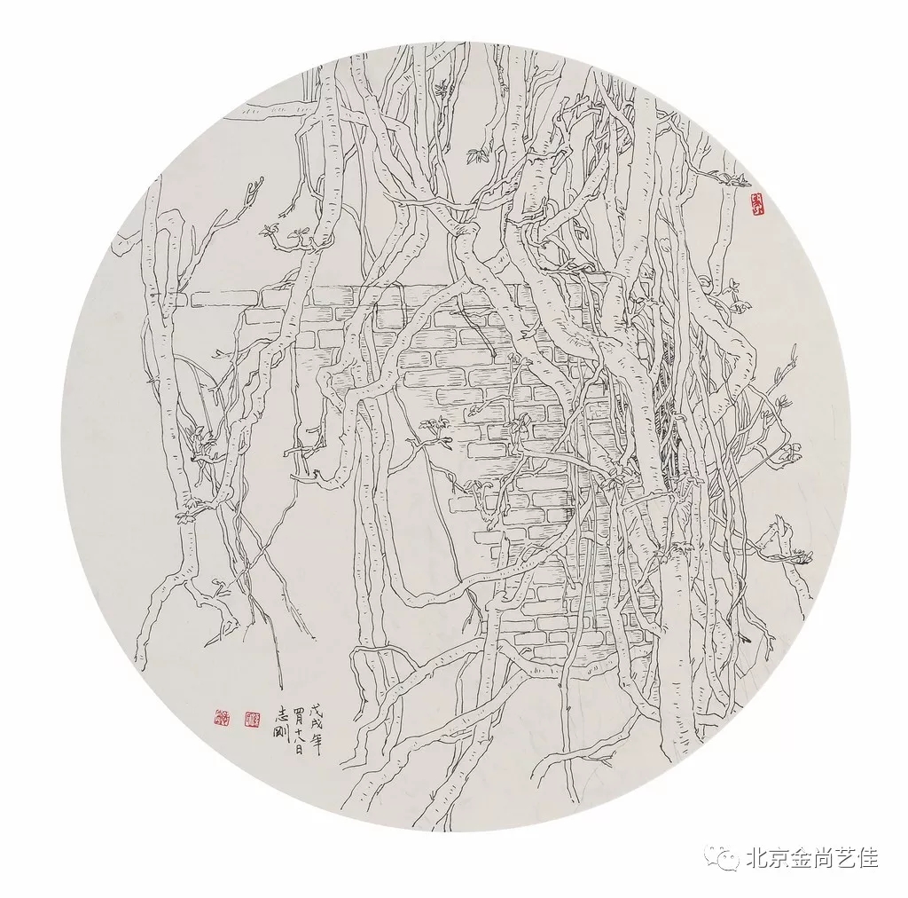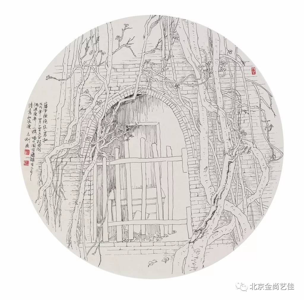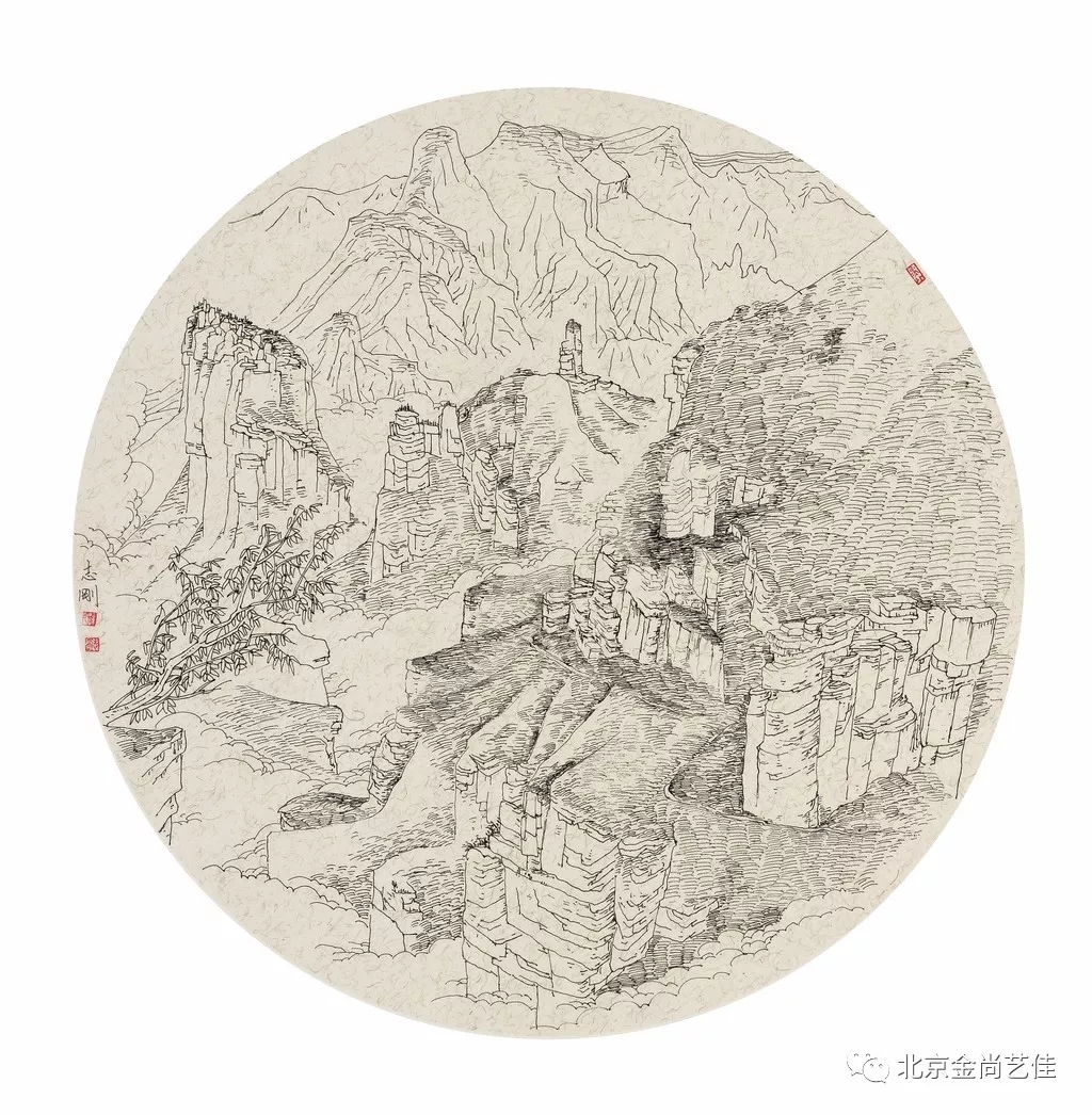 志剛多用針管筆、簽字筆畫寫生,精于提煉,善于取舍。在辨識、梳理山脈溝壑,林木泉石、河床坡岸、屋宇院落等結構形態時,擺脫焦點透視的制約以及“目有不及”、“所見不周”的狹隘視野和眼前實景的約束,予以理性的歸納,注重物象之間的置列與交互,經營畫面,置陳布勢,臨見妙裁。在構圖布局的統領下,線與線之間遵循陰陽辯證、對立統一的法則,依照顧盼、揖讓、交錯、呼應的形式規律組合排列,形成疏密、主次、強弱、繁簡、曲直、齊而不齊、亂而不亂,有秩序的漸次變化,富有韻律和節奏,增強了線描的魅力和畫面的美感,使觀者賞心悅目。