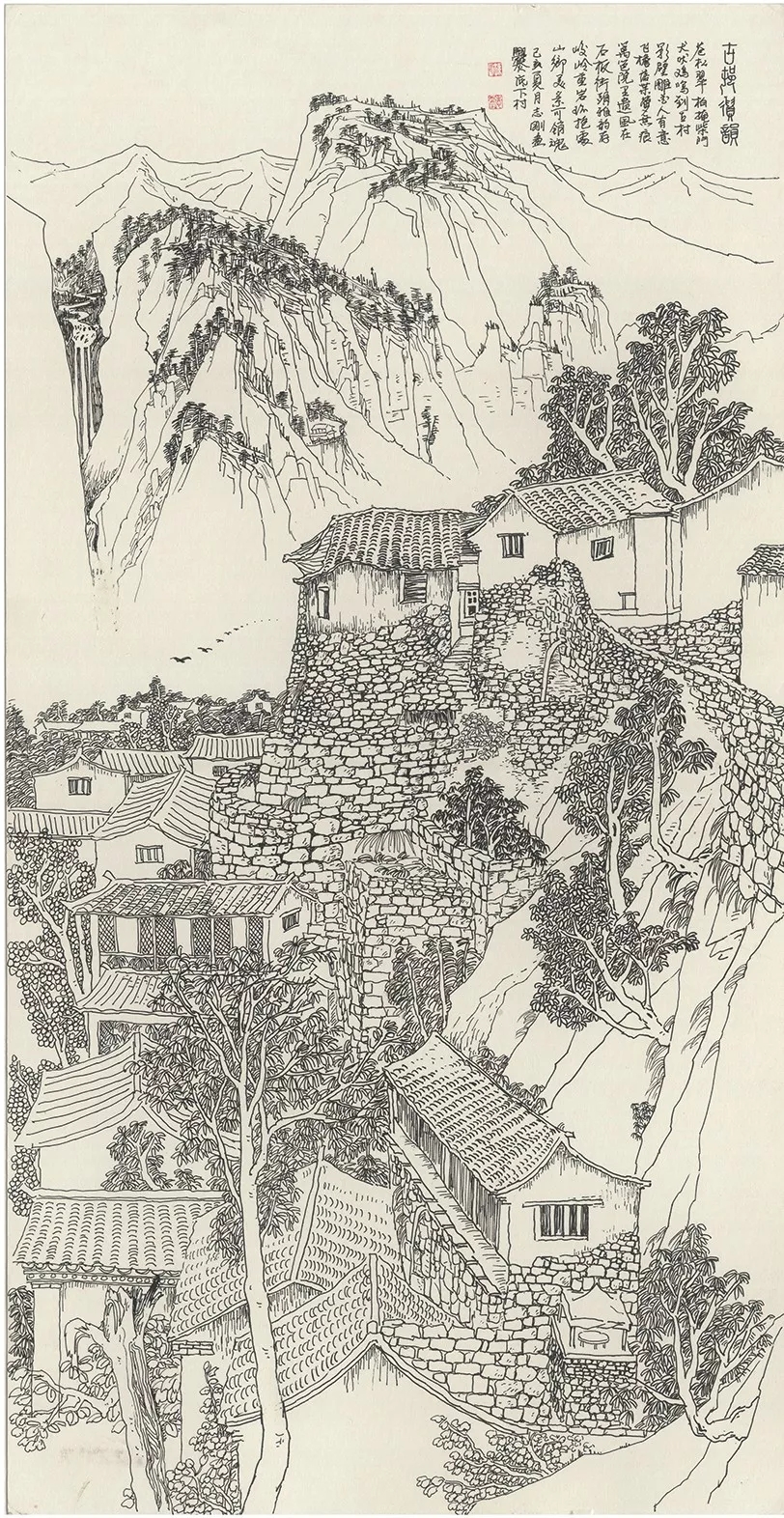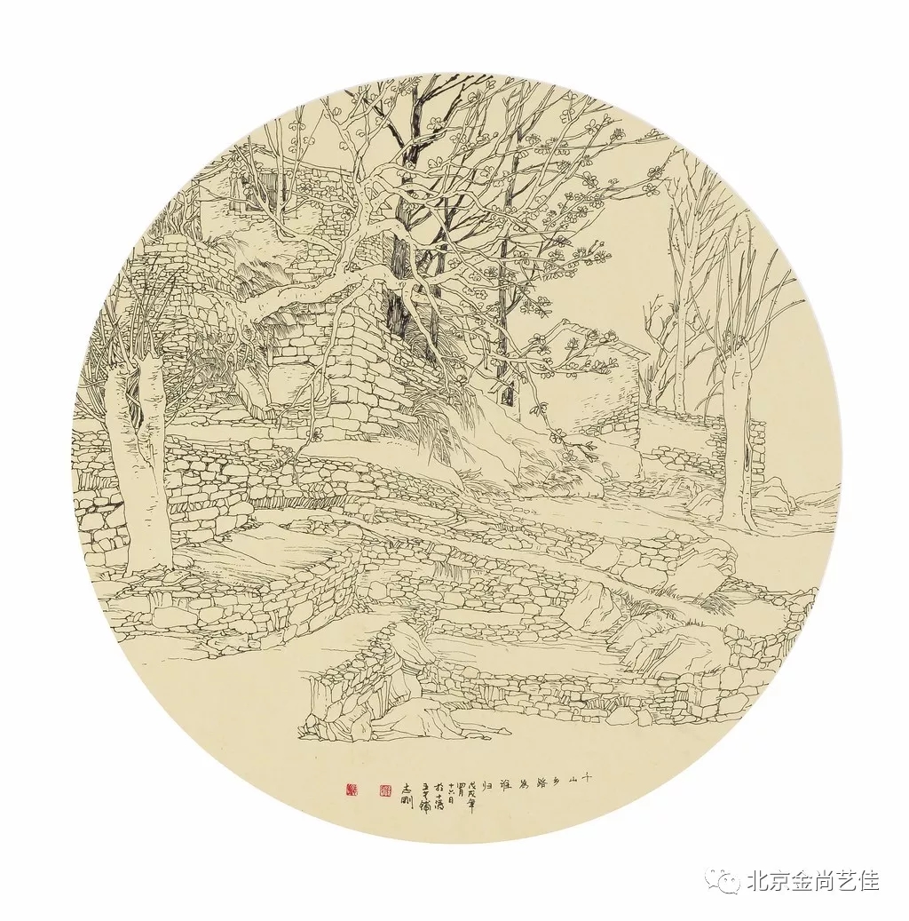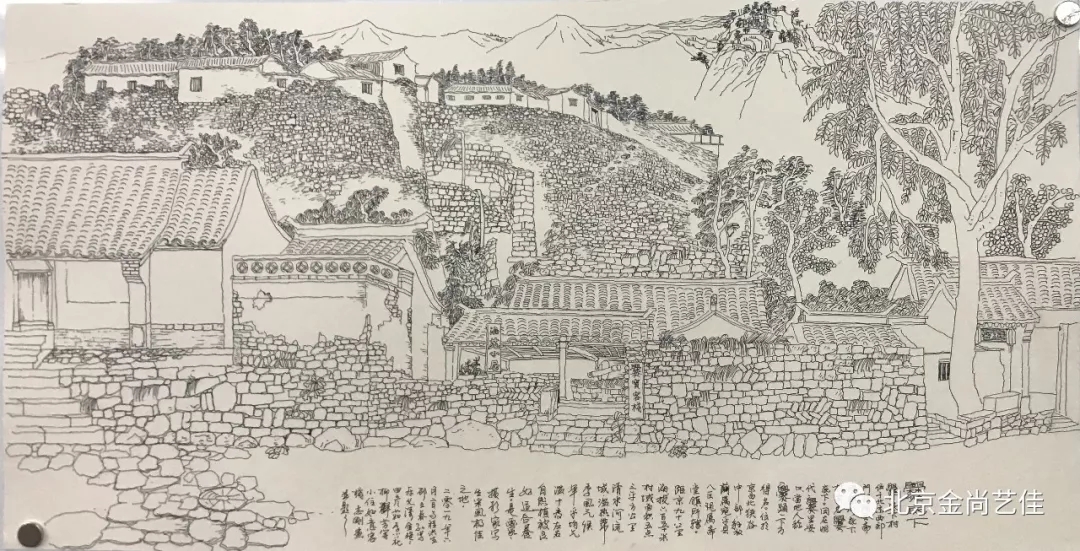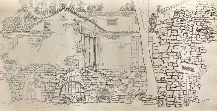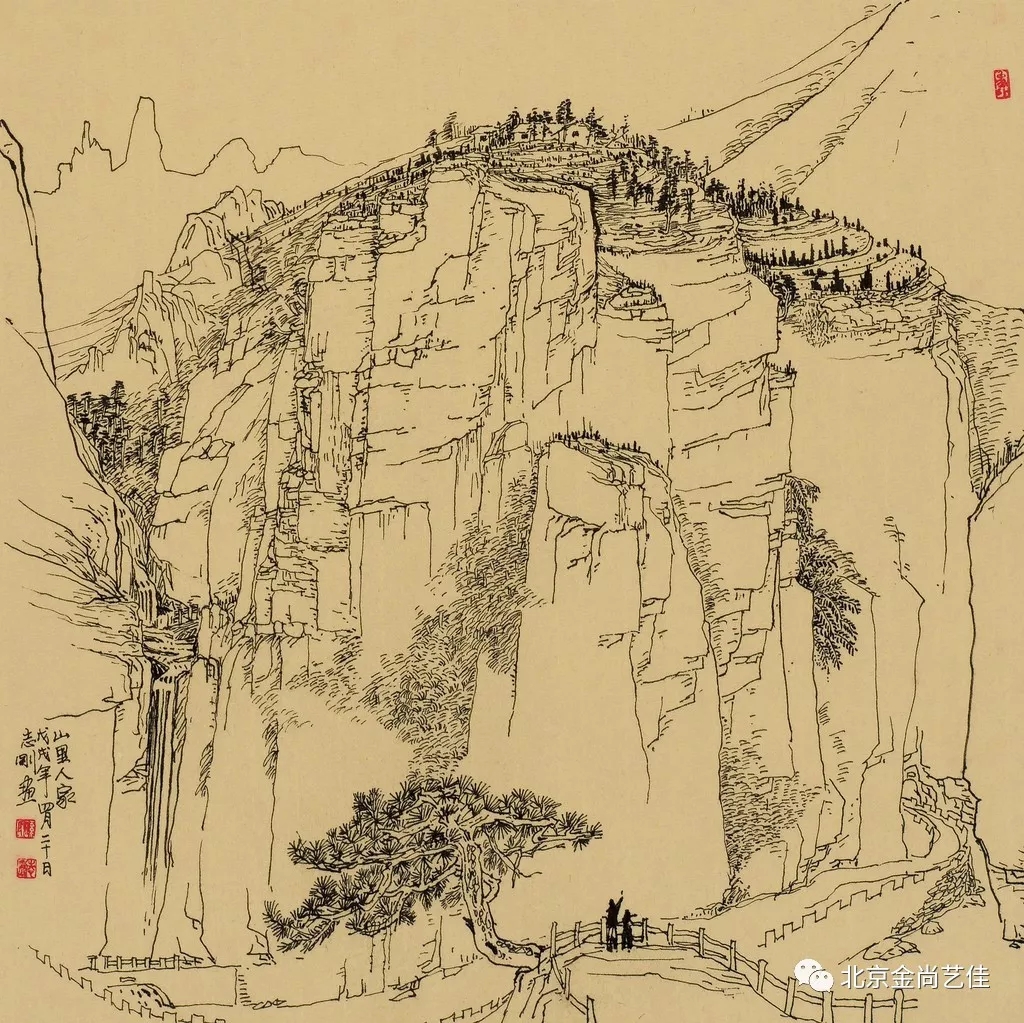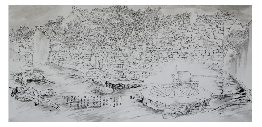 志剛多用針管筆、簽字筆畫寫生,精于提煉,善于取舍。在辨識、梳理山脈溝壑,林木泉石、河床坡岸、屋宇院落等結構形態時,擺脫焦點透視的制約以及“目有不及”、“所見不周”的狹隘視野和眼前實景的約束,予以理性的歸納,注重物象之間的置列與交互,經營畫面,置陳布勢,臨見妙裁。在構圖布局的統領下,線與線之間遵循陰陽辯證、對立統一的法則,依照顧盼、揖讓、交錯、呼應的形式規律組合排列,形成疏密、主次、強弱、繁簡、曲直、齊而不齊、亂而不亂,有秩序的漸次變化,富有韻律和節奏,增強了線描的魅力和畫面的美感,使觀者賞心悅目。