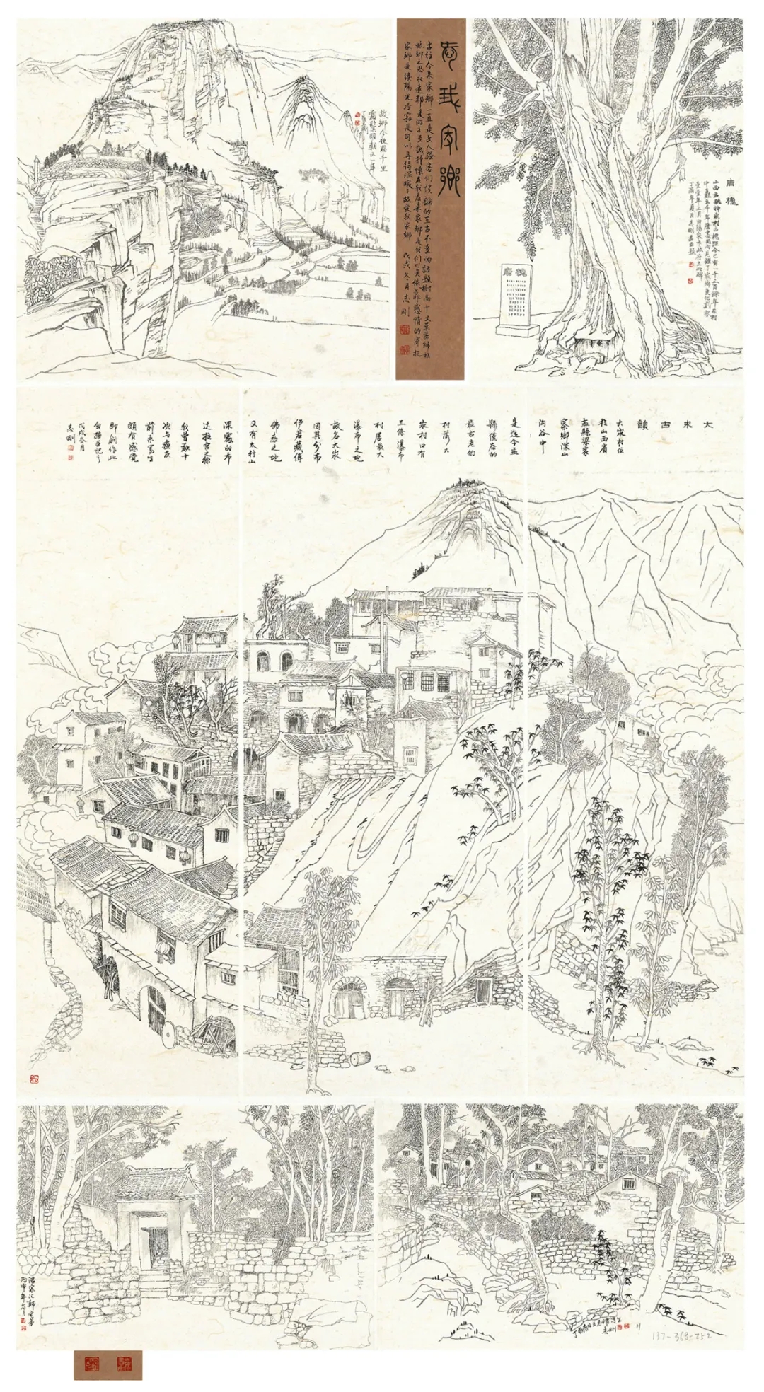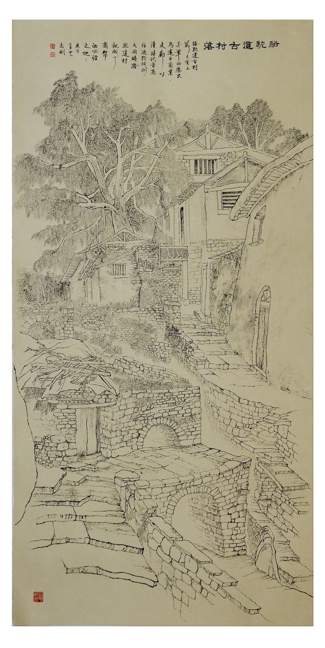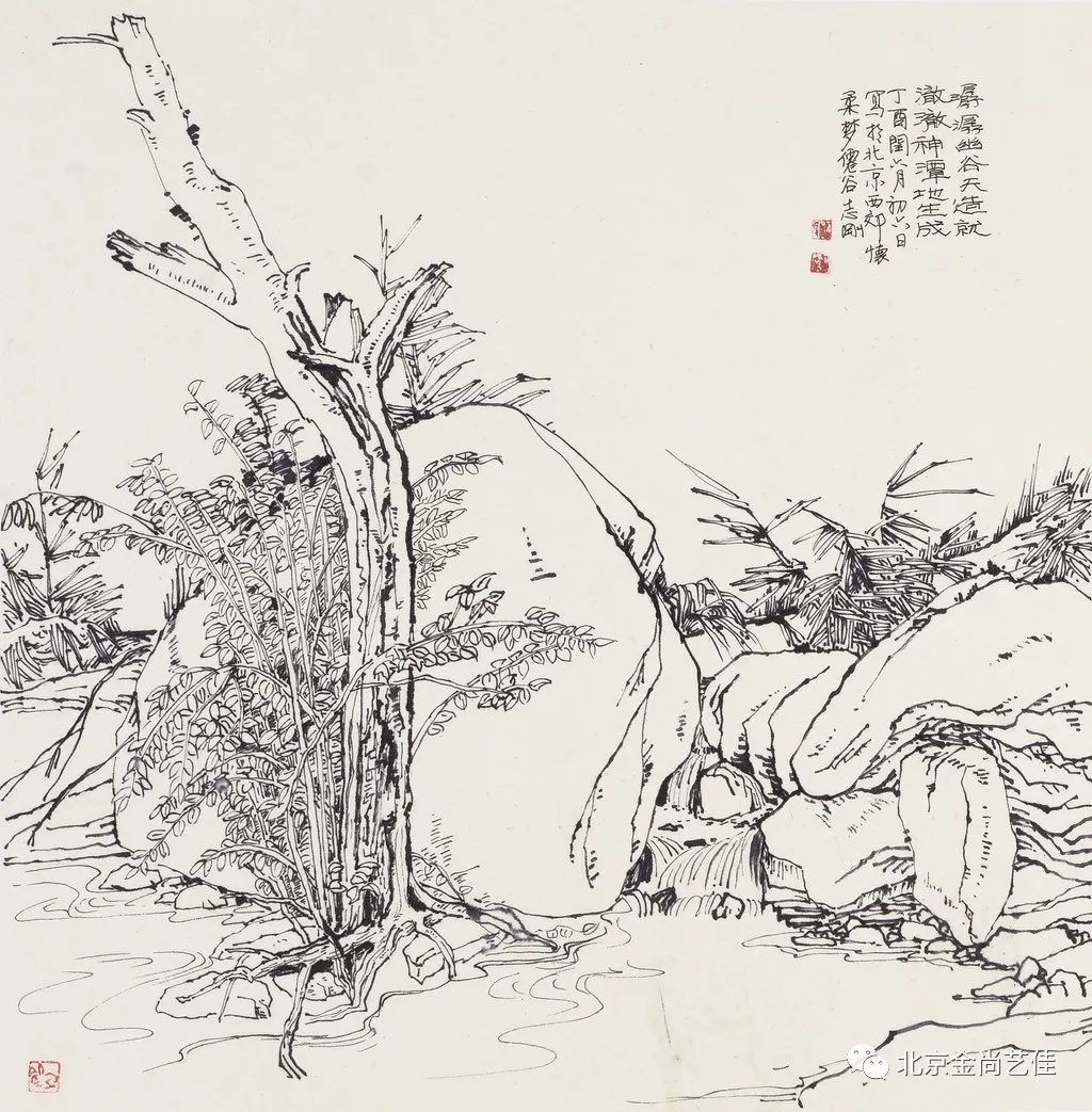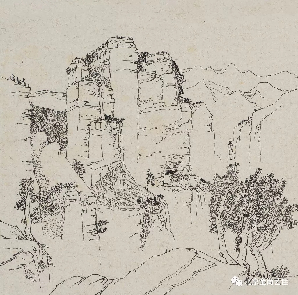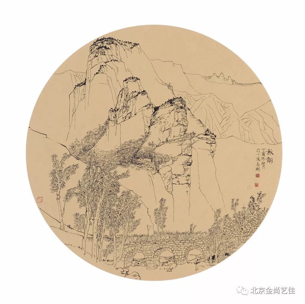 志剛多用針管筆、簽字筆畫寫生,精于提煉,善于取舍。在辨識、梳理山脈溝壑,林木泉石、河床坡岸、屋宇院落等結構形態時,擺脫焦點透視的制約以及“目有不及”、“所見不周”的狹隘視野和眼前實景的約束,予以理性的歸納,注重物象之間的置列與交互,經營畫面,置陳布勢,臨見妙裁。在構圖布局的統領下,線與線之間遵循陰陽辯證、對立統一的法則,依照顧盼、揖讓、交錯、呼應的形式規律組合排列,形成疏密、主次、強弱、繁簡、曲直、齊而不齊、亂而不亂,有秩序的漸次變化,富有韻律和節奏,增強了線描的魅力和畫面的美感,使觀者賞心悅目。