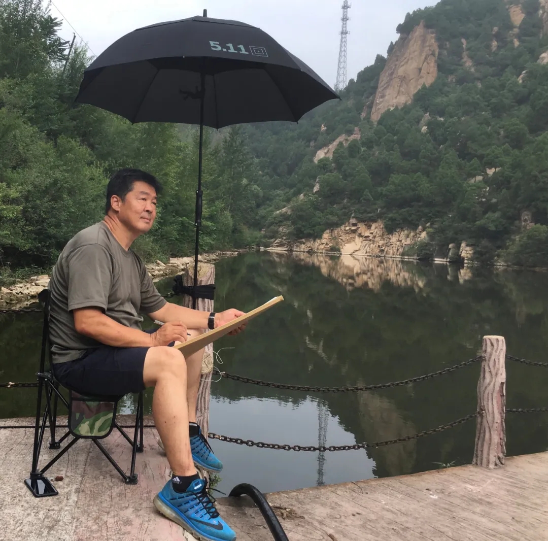 他是山水畫家,多作山水寫生。先后到過京郊十渡、爨底下村,河北寧晉的北太行和河南新鄉、山西陵川的南太行,安徽黃山,海南儋州、三亞、五指山,遼寧本溪關門山和鐵剎山,新疆庫爾勒鐵門關、輪臺胡楊林等地采風寫生,速寫稿盈箱累篋,收獲頗豐。他游弋于山水林泉之中,仰觀俯察,目之所及,盡是崇山峻嶺、古村山居、溪汀水口、石罅流泉、野藤嘉木,云霧煙嵐。在深得山水清氣供養的同時,不斷提升自己把握對象韻致風神的藝術素養,情溢湖山,俯拾萬物,神與物游,托境意生,在狀物精微的寫實基礎上升華到物我交融的境界,將客觀景物化為胸中丘壑,演繹成超越自然的畫境。