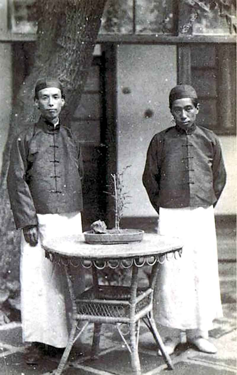 在北京身著長袍馬褂的芥川龍之介(左)
