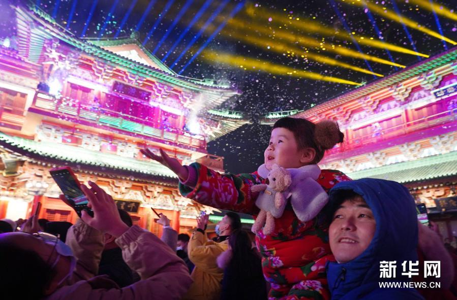 觀眾在觀看《尋夢滕王閣》大型實景演出(2021年1月1日攝)。新華社記者 萬象 攝