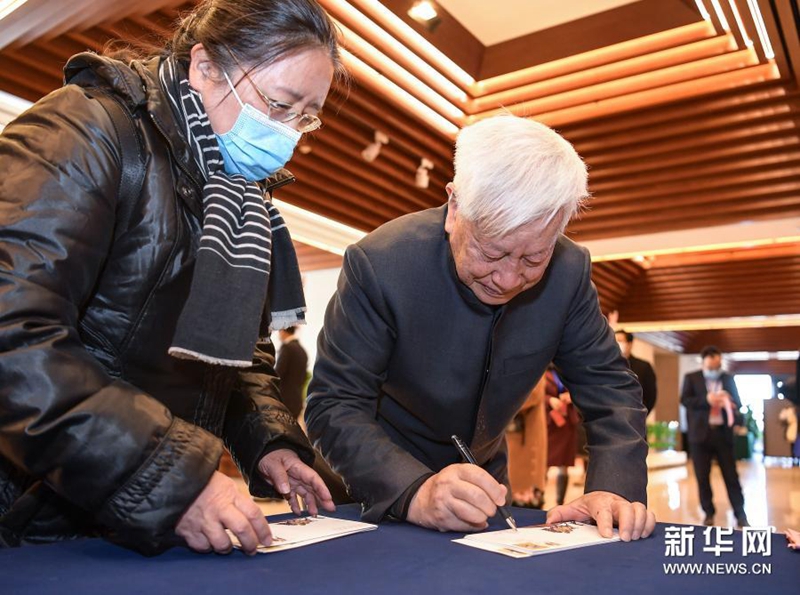 1月5日,《辛丑年》特種郵票設計者、藝術家姚鐘華(右)在北京的首發儀式現場為集郵愛好者的《辛丑年》特種郵票首日封簽名。新華社記者 李賀 攝