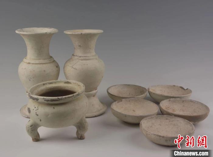 其中一座墓葬中,墓室為正方形,墓室內有橫夾道和棺床,棺床上放男女夫婦合葬棺一具,墓道里出土遍涂白彩的陶爐、瓶、缽、大缽共9件,墓室中男墓主人骨塊中隨葬銅金剛杵。