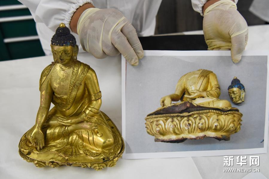 在新疆博物館文物科技保護中心,工作人員展示釋迦牟尼鎏金銅佛修復前的照片(3月19日攝)。新華社記者丁磊攝