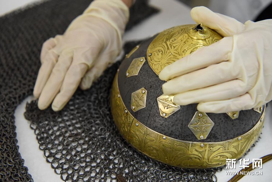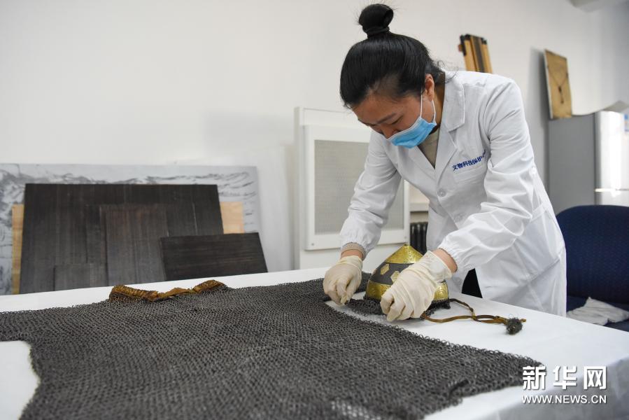 在新疆博物館文物科技保護中心,工作人員整理修復完成的鐵鎖子甲衣(3月19日攝)。新華社記者丁磊攝