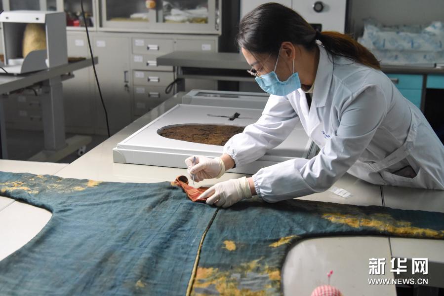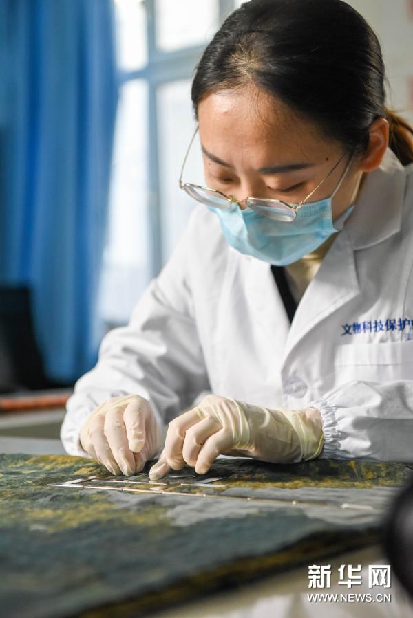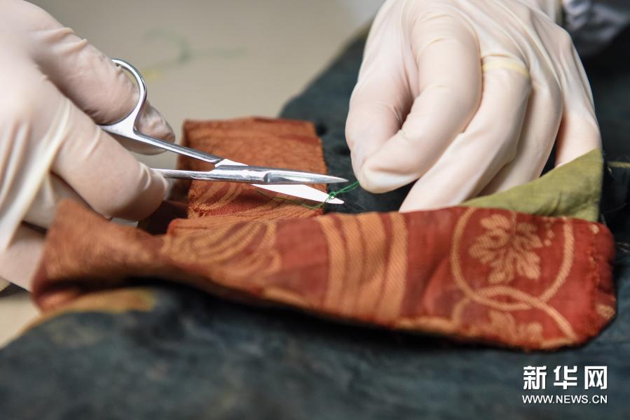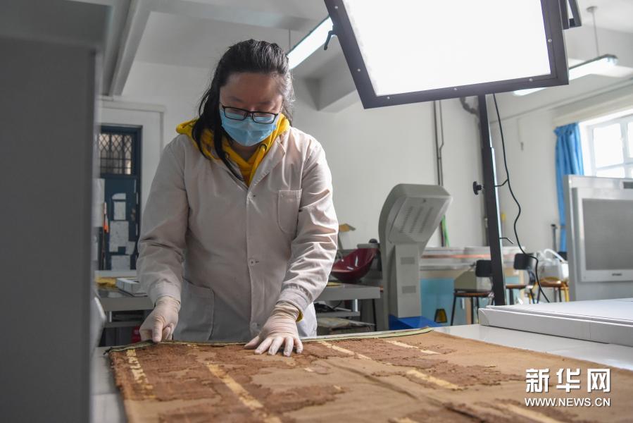 在新疆博物館文物科技保護中心,工作人員在修復寶花鳳紋錦袖暗花綺袍(3月19日攝)。新華社記者丁磊攝