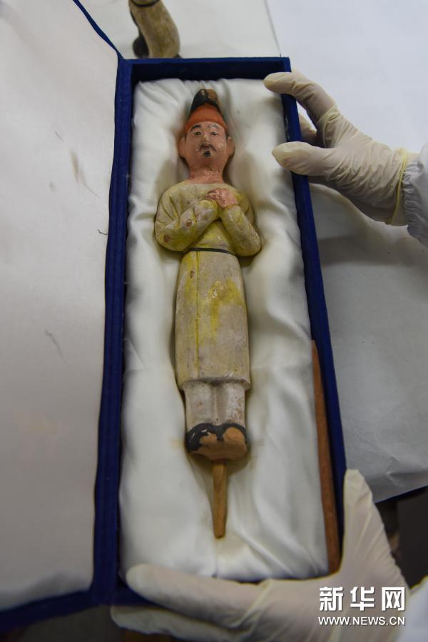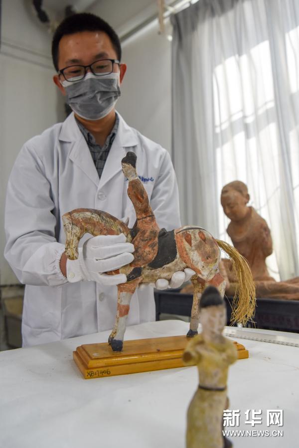 在新疆博物館文物科技保護中心,工作人員展示修復完成的騎馬文官俑(3月19日攝)。新華社記者丁磊攝