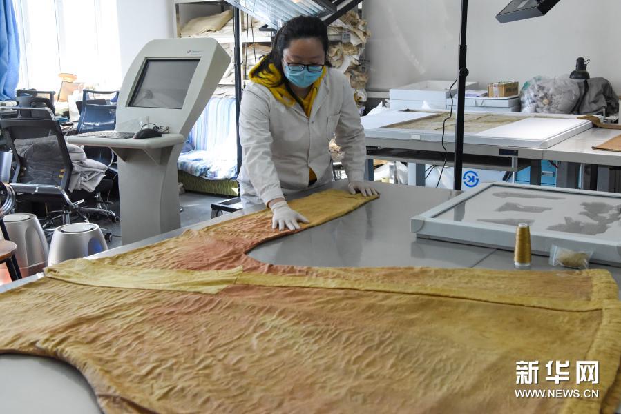 在新疆博物館文物科技保護中心,工作人員整理修復完成的錦緣絹袍(3月19日攝)。新華社記者丁磊攝