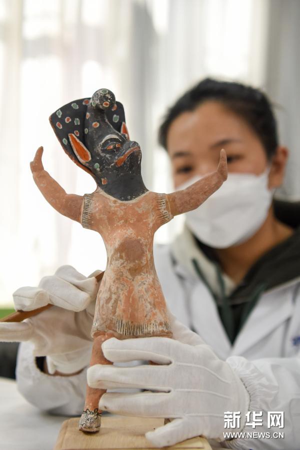 在新疆博物館文物科技保護中心,工作人員對彩繪戴面具舞蹈泥俑的顏料層進行加固(3月19日攝)。新華社記者丁磊攝