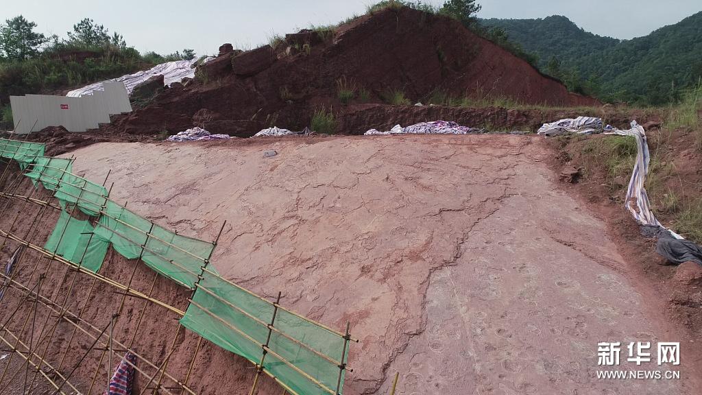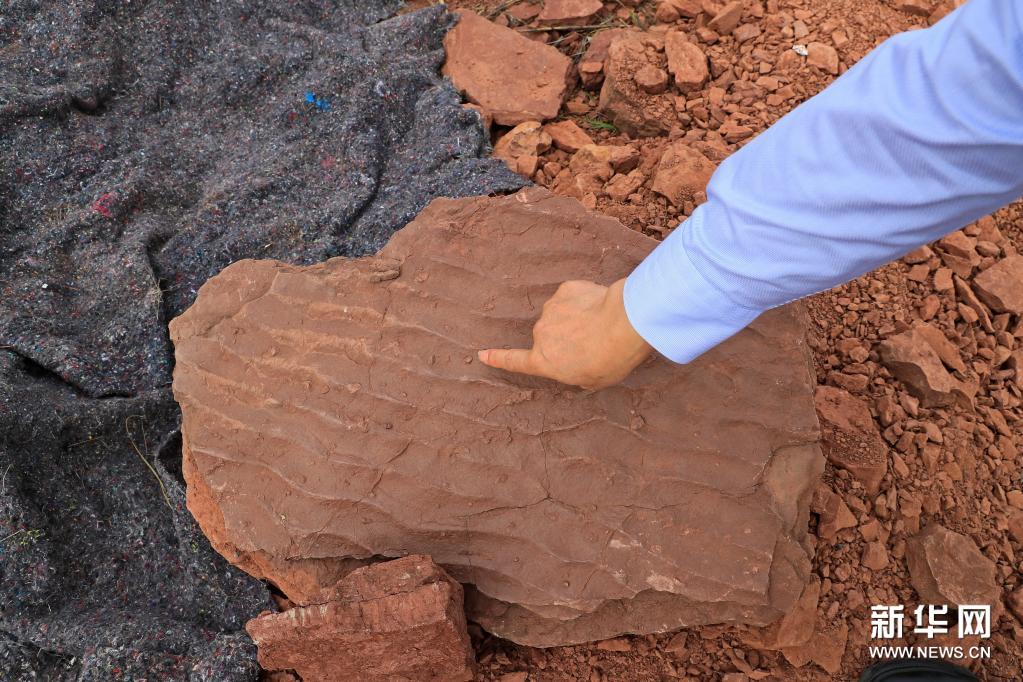 這是新發現的大型蜥腳類恐龍足跡化石(4月6日攝)。新華社發(林斯乾攝)