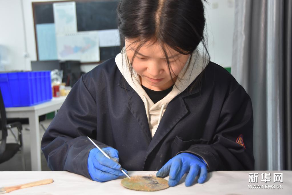 考古工作者在清理銅鏡表面的浮土(4月13日攝)。新華社記者楊一苗攝
