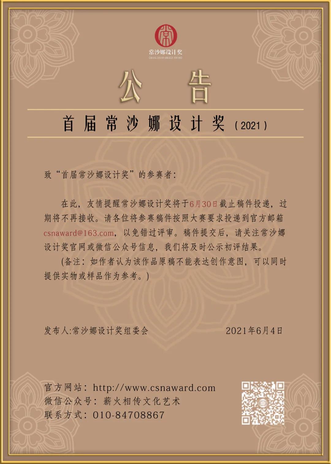 在此,友情提醒常沙娜設計獎將于6月30日截止稿件投遞,過期將不再接收。請各位將參賽稿件按照大賽要求投遞到官方郵箱csnaward@163.com,以免錯過評審。稿件提交后,請關注常沙娜設計獎官網或微信公眾號信息,我們將及時公示初評結果。