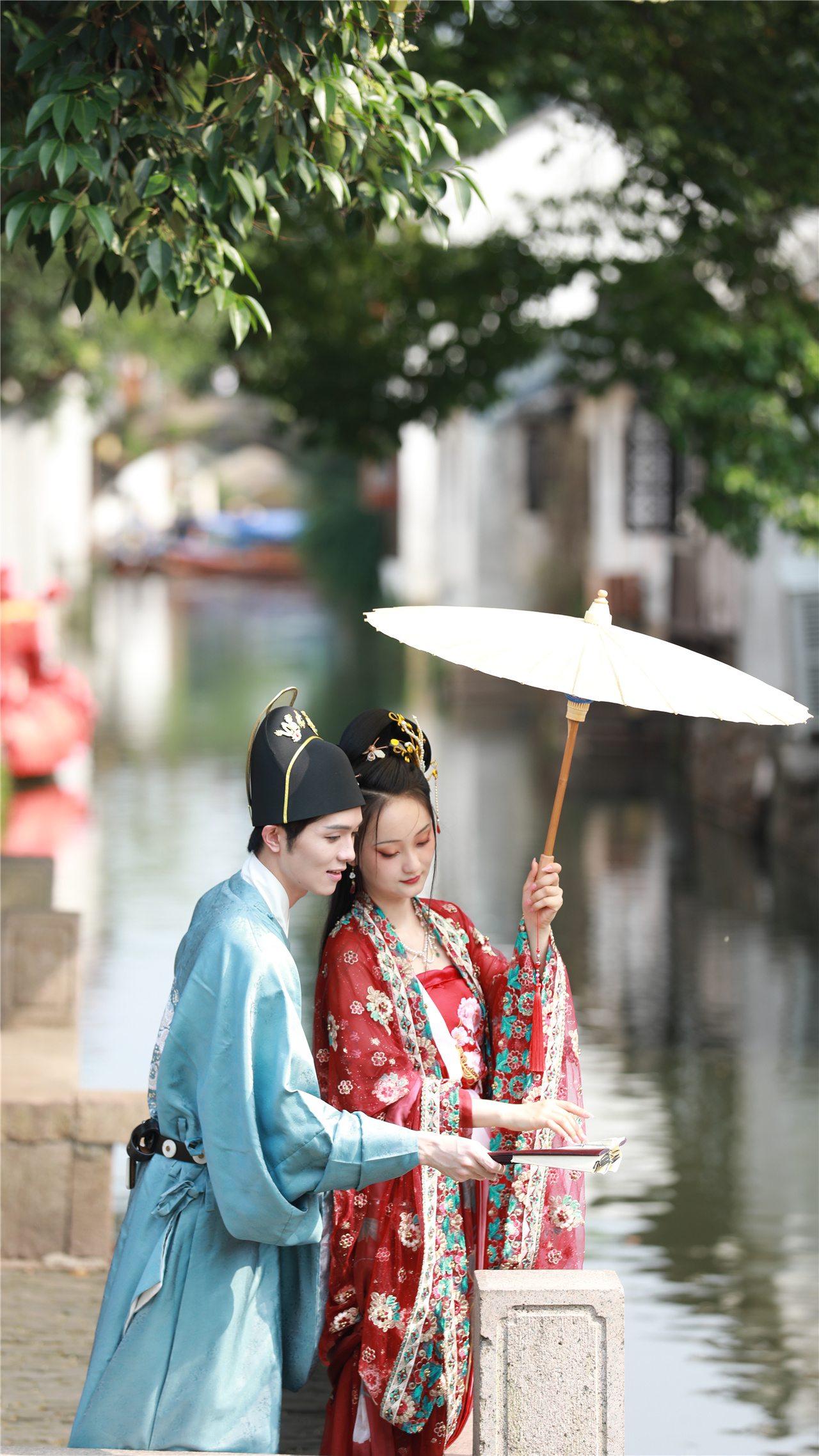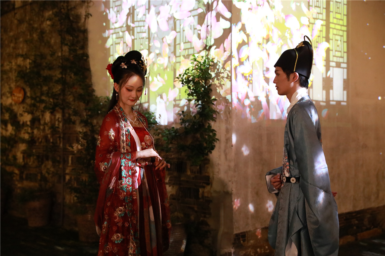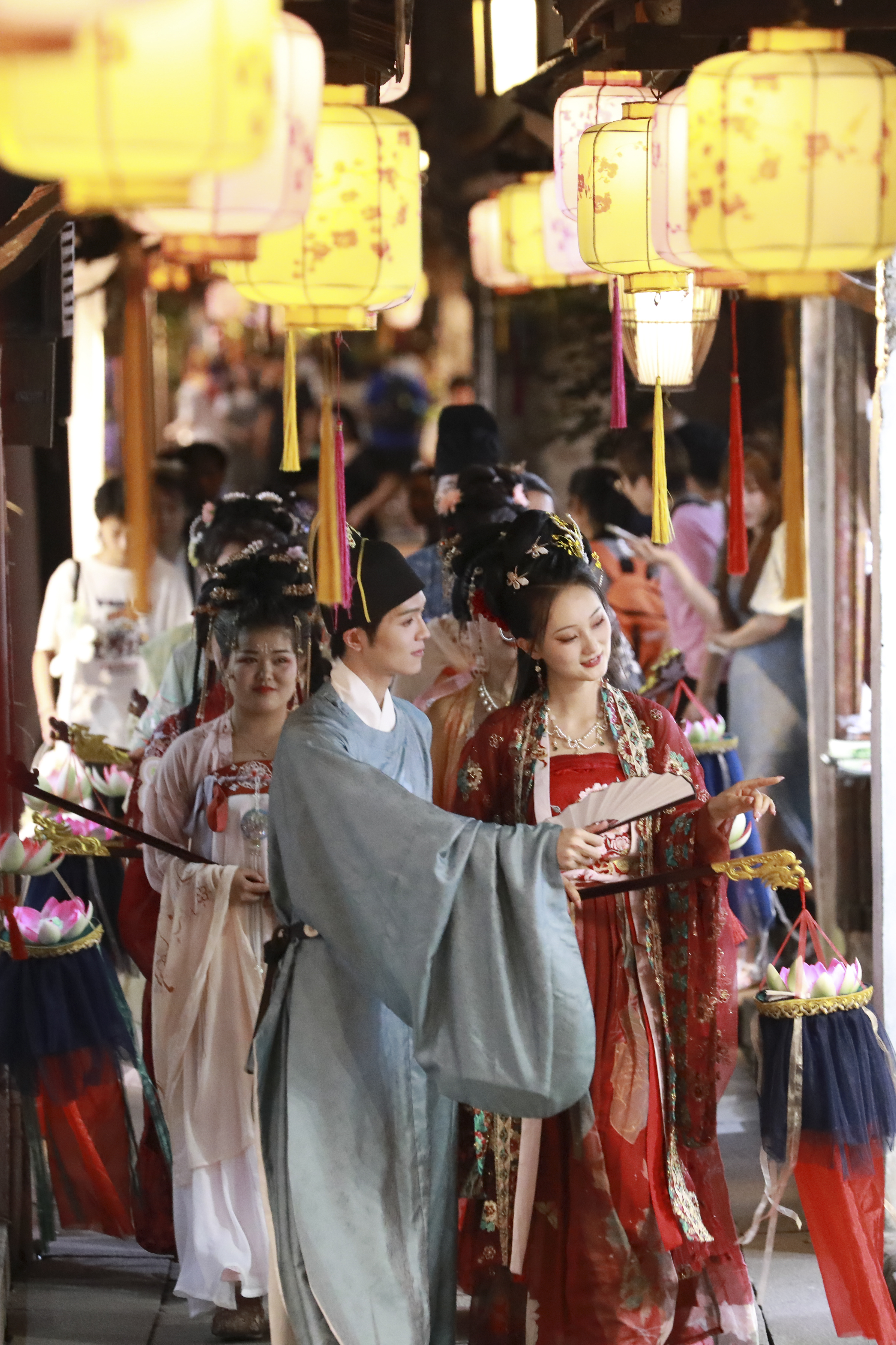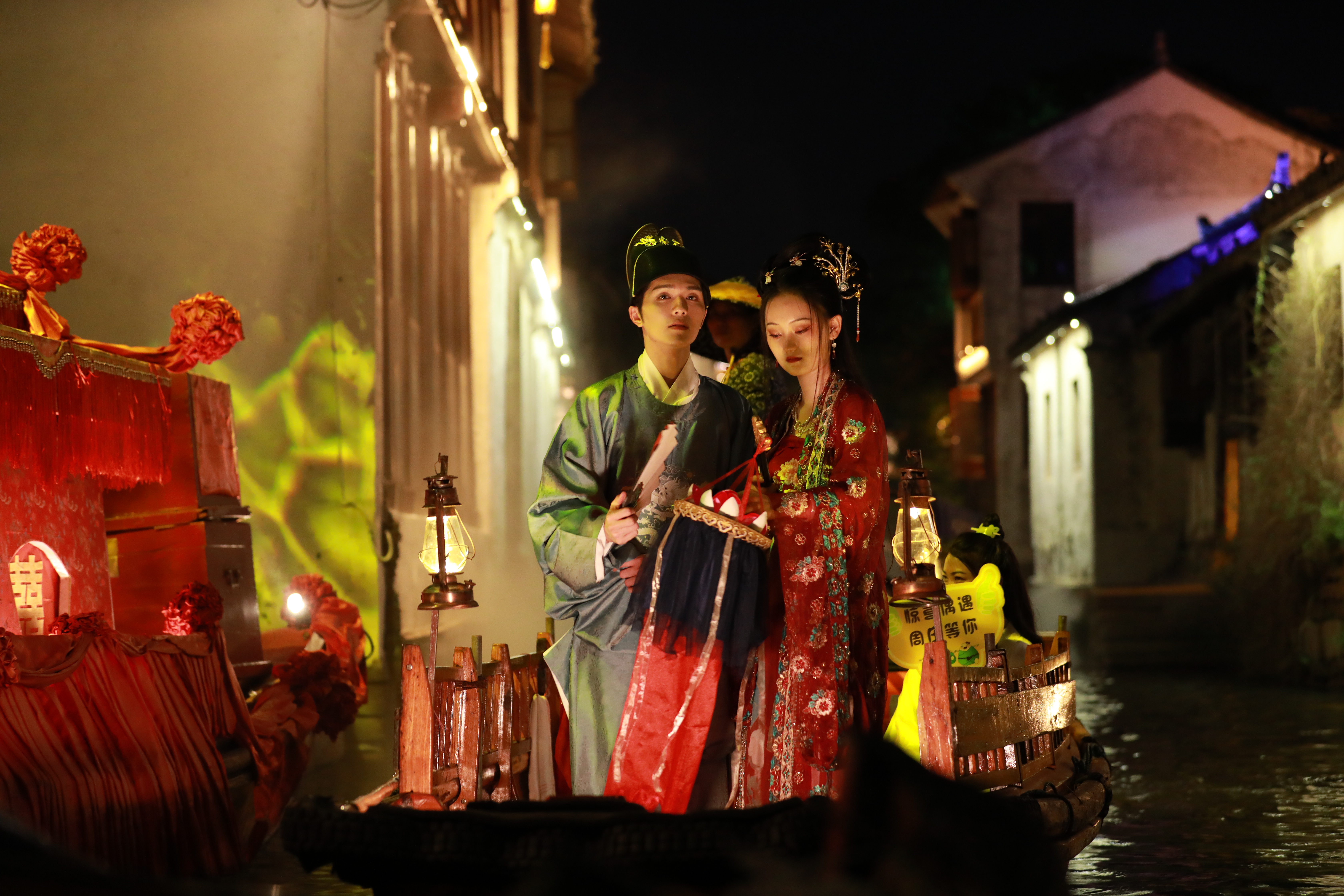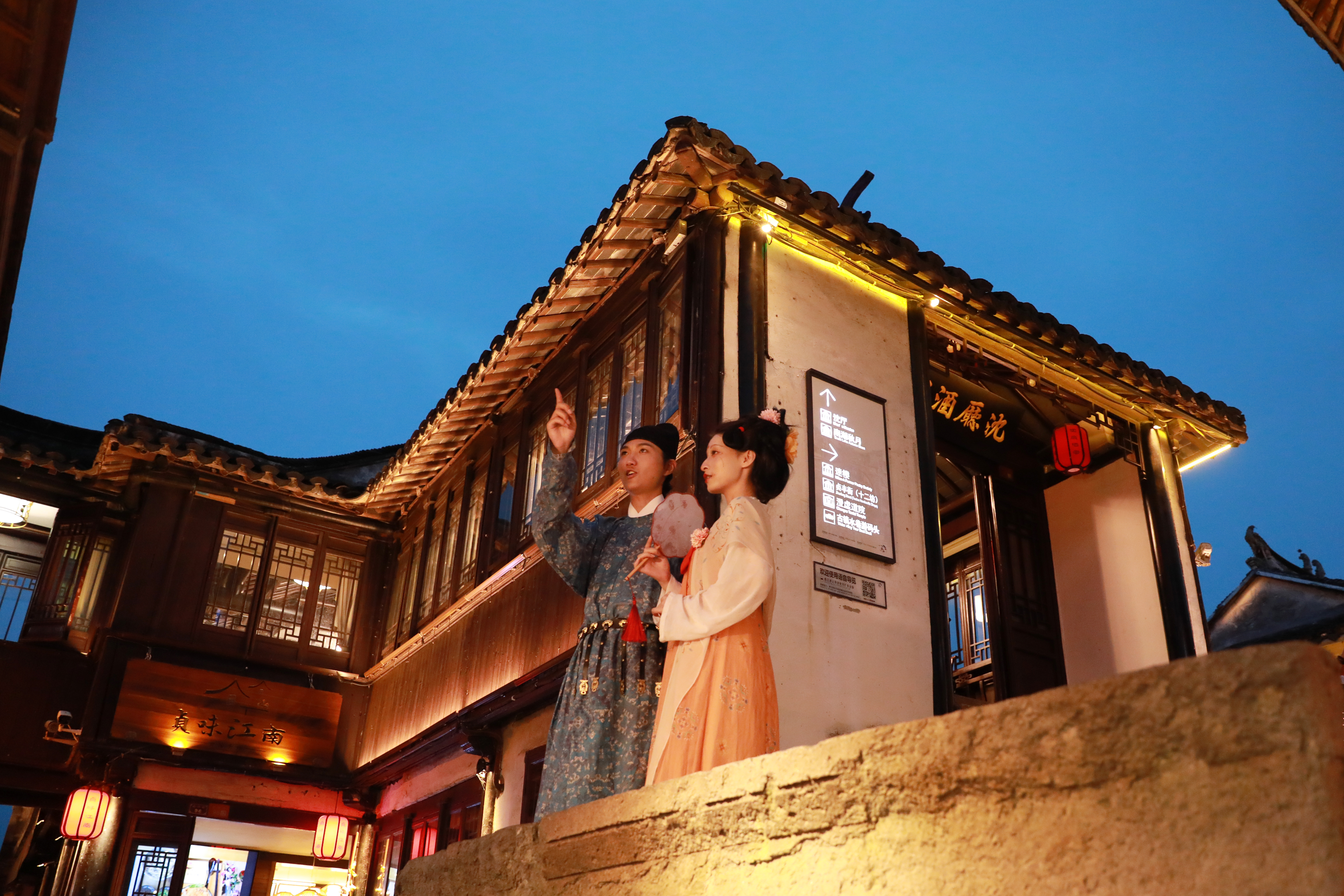 翩翩有禮,詩意周莊。雙橋、富安橋上,漢服才子佳人相聚會友。夜色朦朧,行走其間,縈繞歡語,如入夜畫。