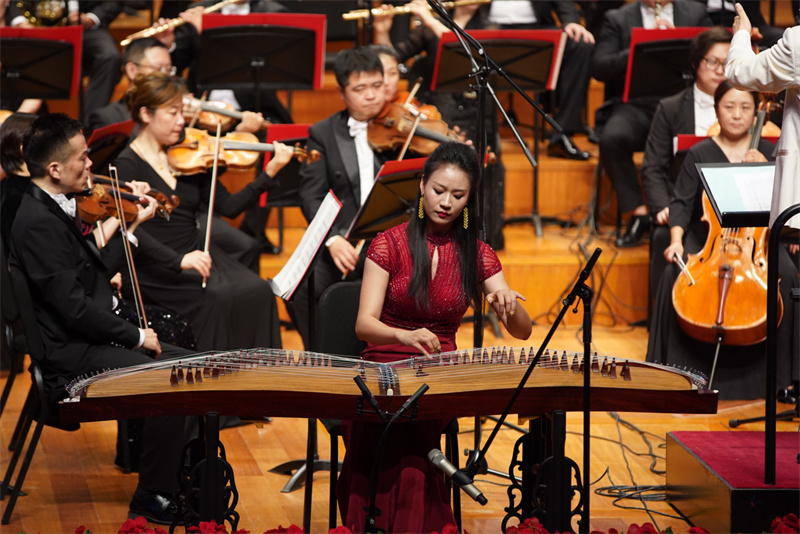 音樂會下半場,著名作曲家于京君先生創作的《中國民歌六首》《廣東音樂四首》《新疆民歌四首》《戲曲六首》帶觀眾在音樂中飽覽祖國的山河風物?!吨袊窀枇住钒粟M南、山西、河北、云南等地區觀眾耳熟能詳的民歌。既有渲染節日喜慶氣氛的山西民歌《對花》和漢族歌舞小調《跑旱船》,又有描寫彝族同胞熱情淳樸的《遠方的客人請你留下來》?!捌胶镌隆薄昂堤炖住迸c“可愛的一朵玫瑰花”“半個月亮爬來”“青春舞曲”則分別出現在《廣東音樂四首》和《新疆民歌四首》中,藝術家們將氣質迥異的樂段用亦或靜謐柔美、亦或熱情奔放的演繹手法完美呈現給觀眾。音樂會的最后,黃梅戲《女駙馬》、越劇《紅樓夢》、豫劇《花木蘭》、京劇《蘇三起解》等劇中的名段被藝術家們進行別開生面的演繹,也令現場熱愛戲曲的觀眾朋友直呼過癮。