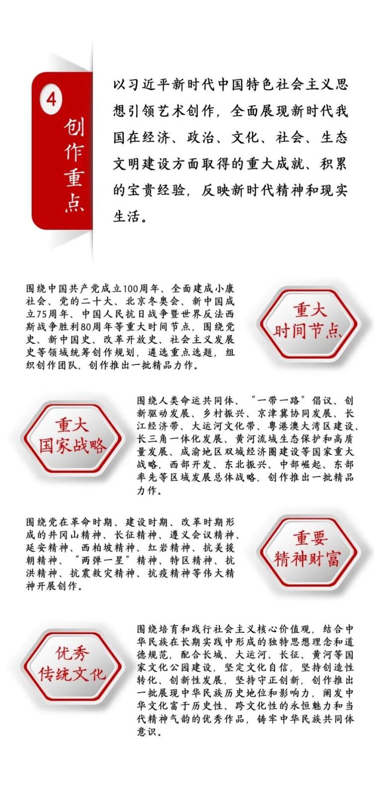 《規劃》緊緊圍繞黨的領導、文化強國、文化自信、新發展階段使命任務、以人民為中心、藝術規律、藝術“高峰”、新時代文藝院團、新時代集體創作、新時代文藝評論等關鍵詞,設定目標任務,策劃工程項目,系統闡明了“十四五”藝術創作發展的總體要求、發展目標、主要任務、創作重點、重要舉措等。