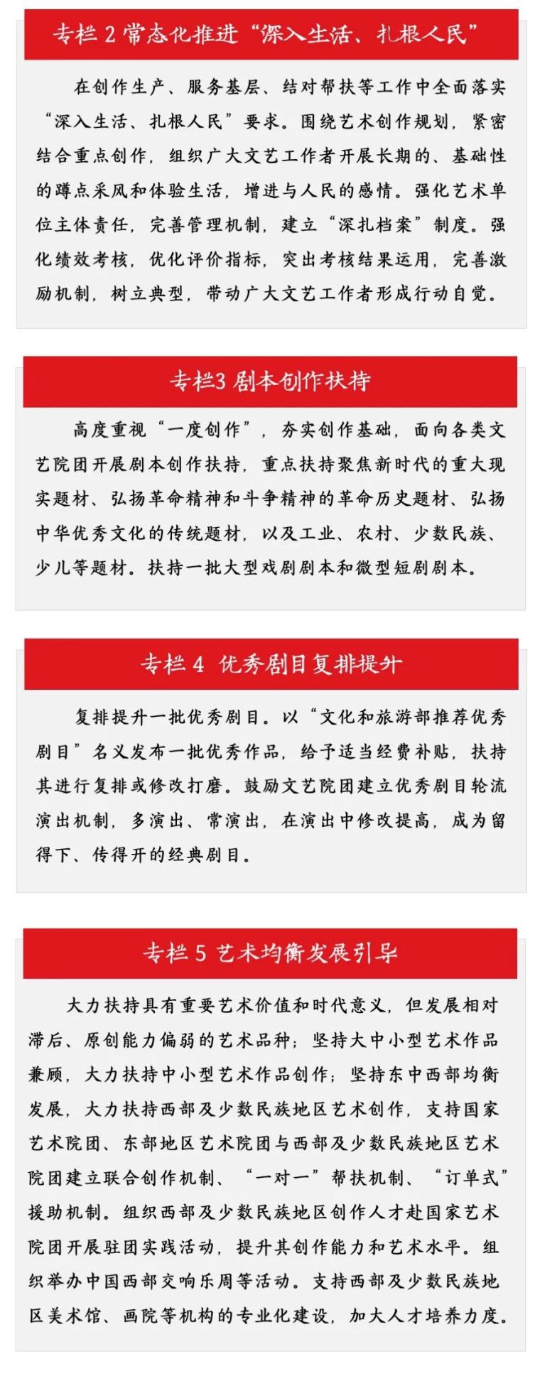 《規劃》在“主要任務”部分提出,要全力推進新時代藝術精品創作、推進中華優秀藝術傳承傳播、推進新時代文藝領軍人才隊伍建設、加強文藝團體建設、構建新時代文藝評價體系,用精品力作吹響時代前進號角、展現時代風貌、引領時代風氣,為中華民族提供豐厚滋養,為世界文明貢獻華彩篇章,努力開創藝術創作繁榮發展新局面。