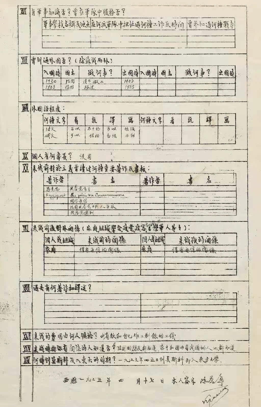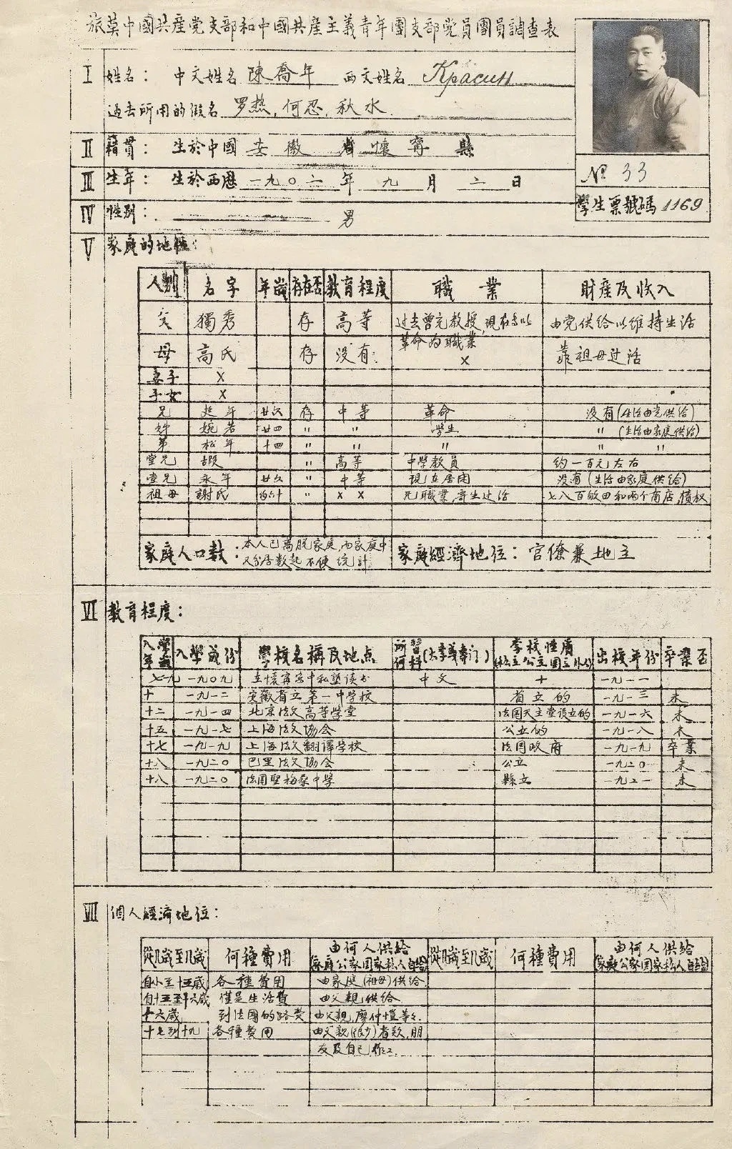 隨著兄弟二人的不斷升溫,更多的信息和史料被發掘和披露,喬年赴俄前的履歷表就是其中之一。在這份履歷表中,細節可愛又熱血。在家庭出身一欄中,他如實填寫為“官僚兼地主”,其實這種出身在早期革命者的身上并不鮮見。