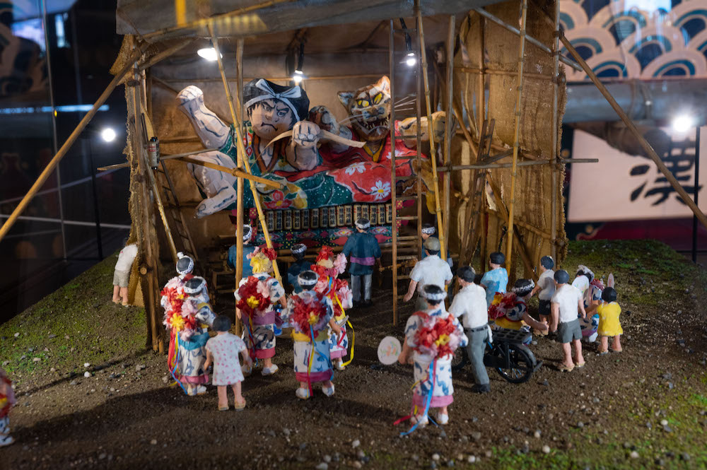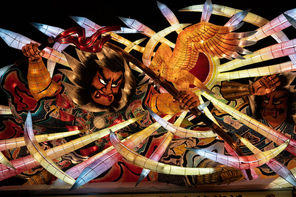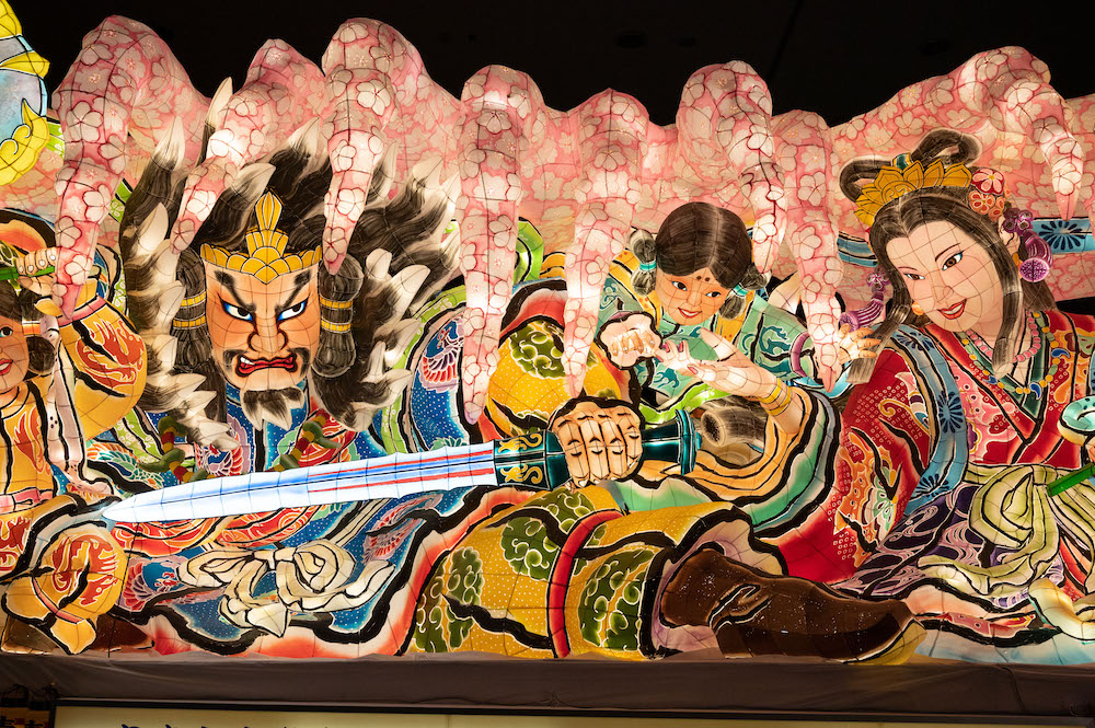 被稱為“佞武多”的巨大人形燈籠花車通常使用木材、金屬絲與和紙制成。盡管由于街道兩邊電線密布,出于安全考慮,佞武多在高度上受到限制,但高5米、寬9米、長7米的規格,在觀感上仍有著強烈的沖擊力。一臺佞武多燈籠花車所展現的人物多為1~3人,在題材的選擇上,古代神話故事、日本武將傳說,甚至《三國志》、《水滸傳》等中國名著里的英雄故事都是最常見的主題。每個佞武多從指間到頭發都栩栩如生,讓人驚嘆制作工藝之高超。