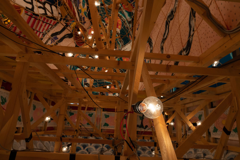 在骨架內安裝照明用的電線與燈,然后貼紙上墨。系廣山圖