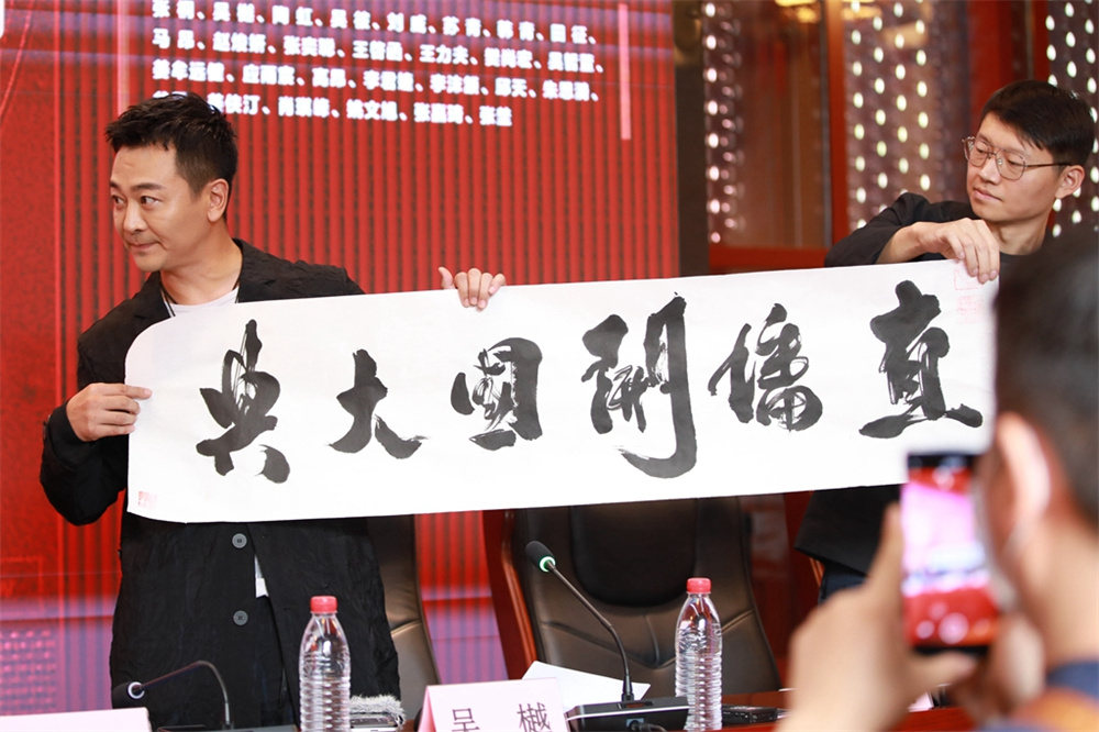 演員吳樾把自己寫的書法送給導演田沁鑫(攝影:王昊宸)