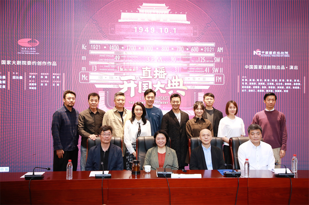 話劇《直播開國大典》由國家大劇院委約創作,中國國家話劇院出品。9月16日下午,中國國家話劇院院長、《直播開國大典》編劇、導演田沁鑫,國家大劇院副院長趙鐵春,演員張桐、吳樾、陶虹、吳彼、劉威、蘇青、韓青、田征、馬昂、趙焌妍出席新聞發布會,暢談該劇臺前幕后的故事。