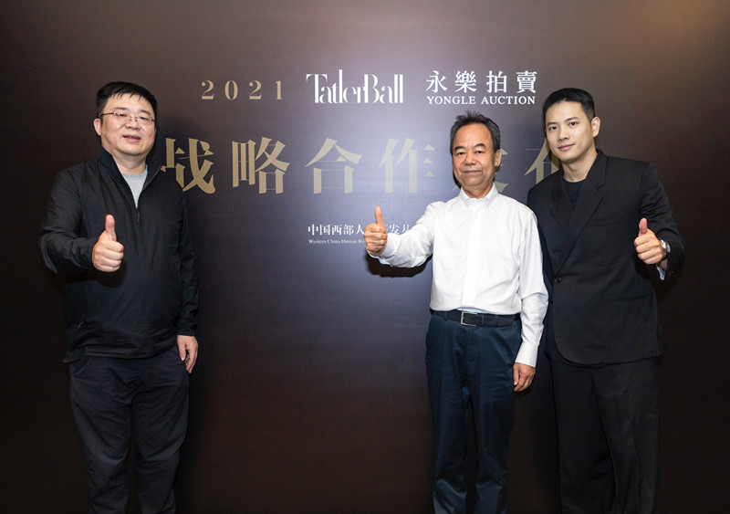 永樂拍賣創始人趙旭(左),中國西部人才發展基金會理事長丁文峰(中),尚流Tatler雜志董事總經理兼主編 Paco Tang(右)出席新聞發布會